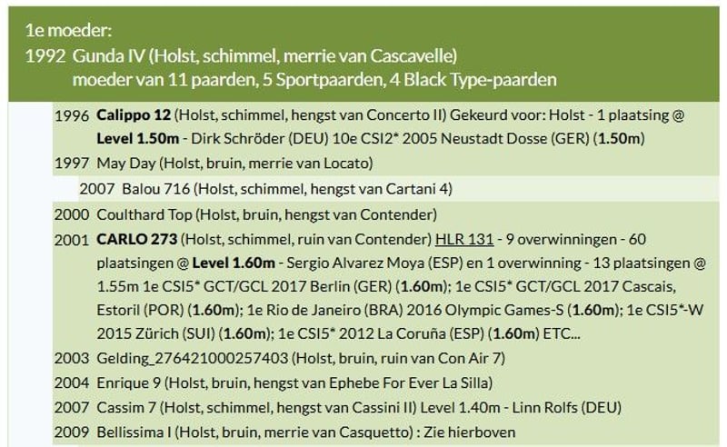 Es la hermana materna de dos caballos de Gran Premio de 1,60 m: el semental Calippo y el campeón olímpico Carlo 273, que lograron mucho éxito bajo Nick Skelton y posteriormente Sergio Álvarez Moya, con 9 victorias y 66 colocaciones en CSI 5* a nivel 1,60 m. También es media hermana de Chris Cross (1,55 m) y Zarlo (1,45 m). Proveniente de la prestigiosa línea de cría 318A2, Bellissima ha demostrado ser una yegua de cría de primer nivel, con cuatro descendientes en la competición, incluyendo Cayadina (1,45 m) con la campeona europea Wilma Hellström y Cortez (1,55 m) con un jinete juvenil húngaro. La madre de Bellissima, Gunda IV, nieta de la legendaria Casall a través de su padre Casqueto, es hermana materna de T-Cantura II (1,50 m) y tía de Lighteningtrail (1,60 m GP con Dieter Mehrens). Estado de exportación: Europa — no es posible exportar el embrión fuera de Europa. Los costes de transporte corren por cuenta del comprador.