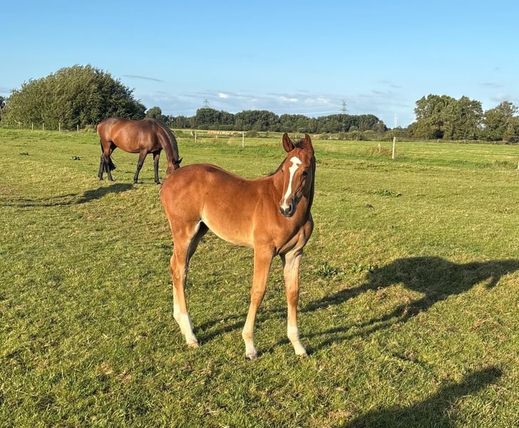 For sale is a colt by Ermitage Kalone (Catoki x Kannan) out of a Holsteiner mare by Nekton x Landgraf x Calypso x Ramiro, Stamm 776. The mother passes on a lot of rideability and willingness to perform and has already produced a licensed son. Ermitage Kalone himself has been making waves in international show jumping for years with his rider Gilles Thomas, achieving numerous victories and placements at 5-star level. The foal is equipped with fantastic basic gaits, impresses with an impeccable character, and was born in early June. For further questions, please feel free to call: 0160-96436624.