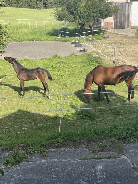 Prämierte Holsteiner Sportstute mit Stutfohlen bei Fuß