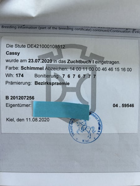 Holsteiner broodmare by Casall x Cassini II. Lineage 563. Height 174 cm. District premium. Born 2012. For sale only as a broodmare due to a sports injury.