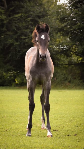 A promising Holsteiner filly foal by Duplexx out of Paramount/Corofino from the successful Stamm 741, born on April 20, 2025. Thora is a typy, long-legged, personable foal with a high percentage of Thoroughbred blood, making her highly interesting for eventing. Her curious and friendly nature wins the hearts of everyone she meets. Her sire, Duplexx, is an exceptionally talented stallion with dual aptitude. In addition to numerous successes in dressage and eventing competitions, he is especially known for his consistent wins in show jumping. He is successful up to S level in both disciplines for his age. Duplexx is considered a rising star among breeding stallions and is one of the most important sons of Diarado. She can leave us from November and is happy to be viewed here. We can provide a holiday apartment if you wish to visit Thora.