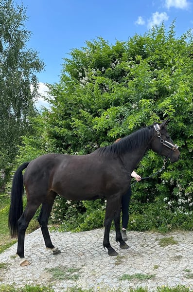 A three-year-old Holsteiner mare from the lineage 1446. Due to her size, she is the perfect transition horse for young riders. She is elegant in dark brown and, as expected, brings the push from the hindquarters inherited from her dam, as well as large, expressive movements from her sire. Parfee was born on our farm and has spent her life in the mare herd. She has not yet been backed, which is an advantage for riders who prefer to take on horses in their raw state to train them according to their own ideas. Parfee is sweet to handle and enjoys being pampered.