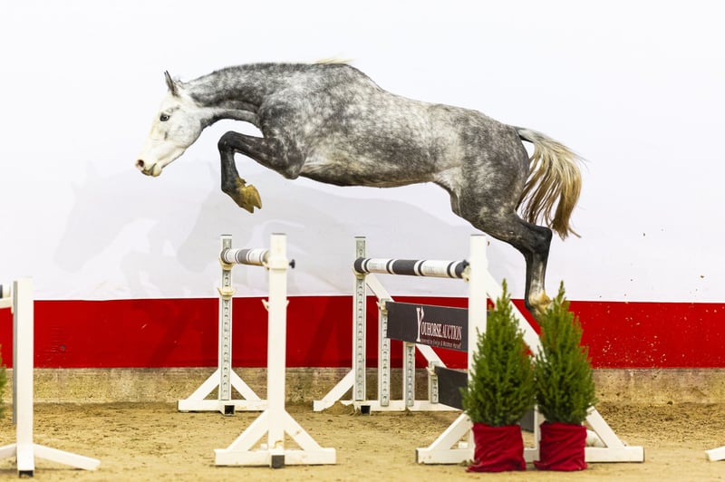 Conquista is a modern, blood-type mare with length, presence and a tall, leggy model. In free jumping she shows quick reflexes, good technique and a strong canter. She moves lightly, uses her body well and shows plenty of athleticism. Important: Conquista is offered as a broodmare. She is completely unbroken, knows no more than a halter and has only lived in the field so far. This allowed her to develop correctly and gain strength in body and limbs. She has never been bred before. Sire Cahil (Cornet Obolensky x Contender) competed successfully at 1.45m level and is known for passing on blood, suppleness and sharpness. Dam Gloria III (Clearway) already produced the 1.40m showjumper End Game VA, and the direct damline includes multiple horses that competed at 1.50m level, confirming the strength of this family. Conquista is bred by one of Germany’s largest and most renowned sport horse breeders. An honest, purely bred mare with a strong type, good jumping technique and a proven damline — highly interesting for breeding purposes.