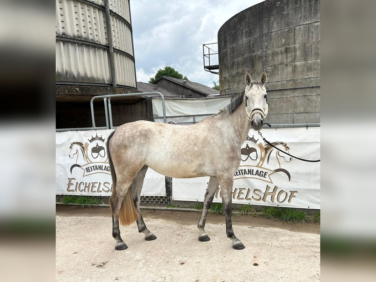 Clara is a stylish 4-year-old gray mare by Clarimo. She is an absolutely well-behaved and clear-headed horse that wants to do everything right when ridden. She is currently being gently started under saddle. Clara is hardworking and has a very positive attitude towards work. We have not yet done any jumps under the rider. She is barefoot, knows pasture, and is used to being kept in a herd. She has a slight overbite, which does not affect her while riding or eating.
