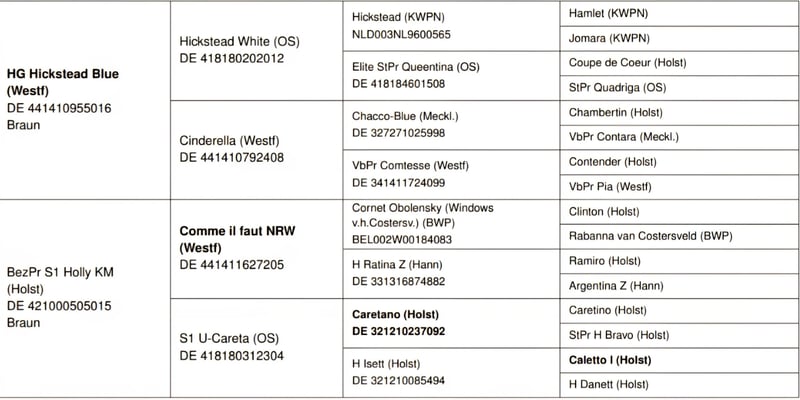 Angeboten wird die Holsteiner Bezirksprämienstute Olivia KM von Hickstead Blue x Comme il faut x Caretano aus dem Stamm 104A, geboren am 10.04.2021. Die Stute hat in 2025 ein prämiertes Stutfohlen von Cascadello I (s. Bilder) gebracht, welches in Spanien einen Stall gefunden hat. Die Stute ist nun bereit ihr sportliches Potential zu zeigen. Olivia KM hat diesbezüglich noch keine Ausbildung erfahren, weshalb sie ausdrücklich als "roh" verkauft wird. Im Rahmen ihrer Stuteneinrragung wurde sie mit einer Größe von 1,69 m gemessen. Der Vater Hickstead Blue, ein beeindruckender Westfale aus dem Jahrgang 2016, hat sich sowohl im Sport als auch in der Zucht einen Namen gemacht. Mit über 20 Platzierungen in 35 Starts zeigt er seine Vielseitigkeit und Leistungsbereitschaft. Unter Marie Ligges gelang ihm ein Sieg in einem internationalen M*-Springen. Unter Nico Lupino setzt er diesen Weg fort. Als Siegerhengst ausgezeichnet, überzeugt Hickstead Blue mit seiner Vererbungskraft. Besonders hervorzuheben ist seine Abstammung. Sein Vater, Hickstead White, ein Oldenburger Springpferd, und sein Muttervater, der renommierte Chacco-Blue, tragen zu seiner herausragenden Genetik bei. Aus der Ururgroßmutter Danett entstammen die gekörten Hengste Alcatraz (von Accord II), Amidou (von Alkatraz), WT Lillix (von LioCalyon) und WT Lakota (von LioCalyon) mit Drew Weber. Die Urgroßmutter Isett brachte die Springpferde Quicky H (von Quick Star) mit Tina Deuerer, Campino H 2 (von Calato) mit Petra Püttmer, Casino Royale 17 (von Calato) mit Dr. Dominik Roeder, Cendrillon Marron (von Coriano) mit Josefine Martinello, Zalazar D (von Zinedine) mit Noa Ben Zeev und Victoria D (von Vagabond de la Pomme) mit Tamina Seibold. Aus der hochinteressant gezogenen (8x Ramzes AA) und fruchtbaren Großmutter U-Careta entstammen inzwischen 9 Pferde, darunter die in der Vielseitigkeit in den USA sehr erfolgreichen Friday (von Chin Champ) mit Adisso Hagan und Clueso (von Clarimo) mit Maya Clarkson. Die Mutter Holly KM musste wegen einer Verletzung bereits früh in die Zucht wechseln. Sie erhielt ebenfalls eine Bezirksprämie und brachte bislang 5 Fohlen, 4 davon prämiert. Die Geschwister zeigen sich im Umgang durchweg freundlich, aufgeschlossen und zuverlässig. Olivia kann bei Interesse gern vor Ort besichtigt werden. Ihr in 2025 geborener Halbbruder von Million Dollar ebenfalls(s. weitere Anzeigen). Auch die Mutter Holly KM kann besichtigt werden. Weitere Informationen auf Anfrage. Transport ggf. nach Absprache möglich.