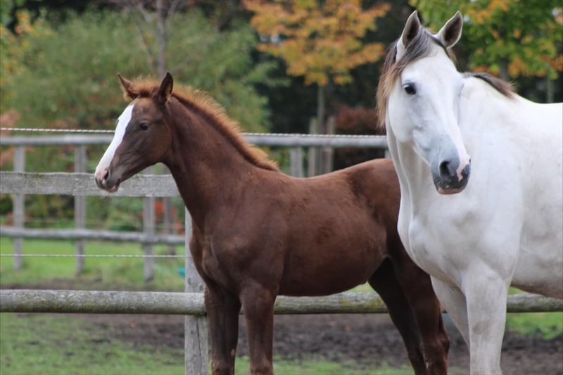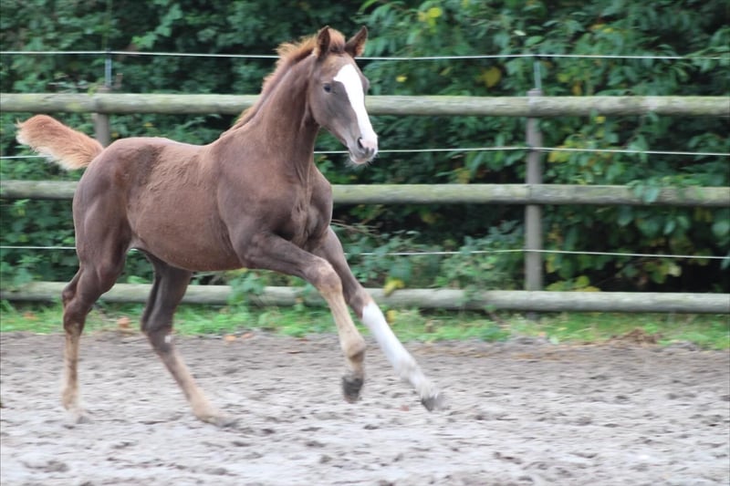 Schickes Stutfohlen in auffälliger dunkelfuchs Jacke von Casall aus einer Del' Arko X Corrado II Bezirksprämienstute aus dem alten erfolgreichen Stamm 754. Unser am 14.07. geborenes elegantes Stutfohlen ist ein echter Eyecatcher mit einem edlen Körperbau, korrektem Fundament, auffälligen Abzeichen und zeigt tolle elastische Bewegungen und hat vor allem den richtigen Biss für den großen Sport mit einem einwandfreien Charakter. Videos können wir bei Bedarf gerne schicken. Da wir aktuell unsere Holsteiner Zucht verkleinern, schauen Sie sich auch gerne unsere anderen Inserate an.