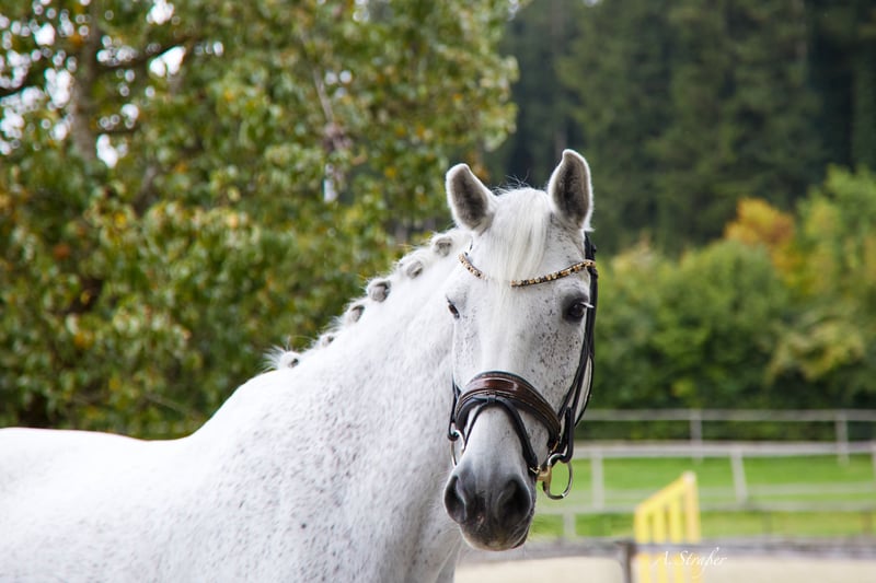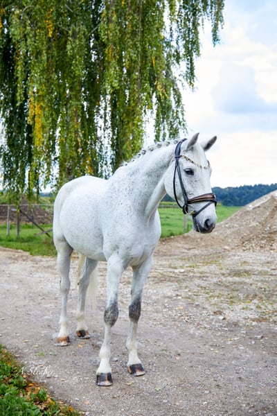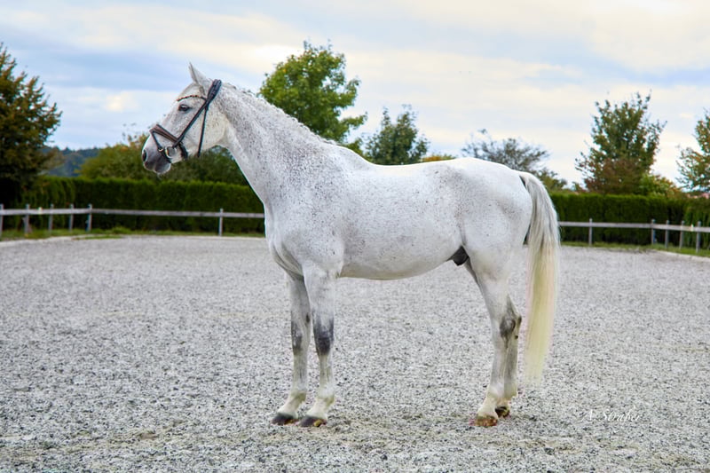 Zum Verkauf steht ein bildhübscher und äußerst qualitätsvoller 13-jähriger, ca. 173 cm großer Holsteiner Wallach von Catoo x Mayflower. Der Wallach ist bis Intermediare I ausgebildet und kann Erfolge bis S** am Turnier vorweisen. In der letzten Saison fungierte er als Lehrmeister für ein junges Mädchen, welches er innerhalb kürzester Zeit von A bis S getragen hat. Ausgestattet mit drei hervorragenden Grundgangarten sowie einer außergewöhnlichen Arbeits- und Leistungsbereitschaft, bringt der Wallach alles mit, was das Sportreiterherz begehrt. Cantando ist sehr einfach zu reiten, in jeder Hinsicht unkompliziert und verzeiht auch Reiterfehler. Mit Piaffe, Passage sowie Einerwechsel wurde begonnen - somit ist der Wallach durchaus ein potenzielles Grand Prix Pferd. Auch im Umgang ist er absolut brav, menschenbezogen und verschmust. Natürlich kennt unser Schimmi auch das Ausreiten und ist auch hierbei ein Verlasspferd! Ebenso schmiede- und verladefromm. Ausschließlich aufgrund von Zeitmangel (Studium) schweren Herzens an Bestplatz zu verkaufen! Eine AKU inkl. Röntgenbilder ohne Befund aus 2023 liegt vor! Anfragen bei ernsthaftem Interesse bitte nur telefonisch oder per WhatsApp unter +49 176 46187186
