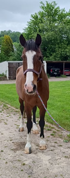 I am offering my adorable, affectionate, and gentle senior gelding as a companion horse. He has arthritis and moves somewhat stiffly, so he is only limited in his riding ability. I would like to find him a loving home with a protection contract, where he will be cared for and pampered. He enjoys walks, light rides, and perhaps has an interest in groundwork or light work in the arena. Jim lives in a small mixed herd in an open stable, and his new home should provide the same environment to keep him active. Additionally, he should be able to go out to pasture during the summer. Special feed is currently not necessary but should be kept in mind for older horses. He does not require medication and, aside from his arthritis, is fit and robust. He is currently barefoot. He has never had issues with his lungs or digestive system. Jim is a lower-ranking horse and very compatible with other horses. Unfortunately, I no longer have enough time to care for him as he deserves and as would be best for him. This is not an emergency surrender; it must be a 100% match. Feel free to contact me with questions or videos, or to arrange a visit.