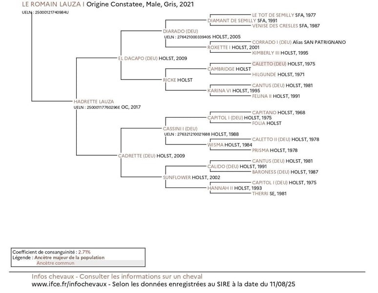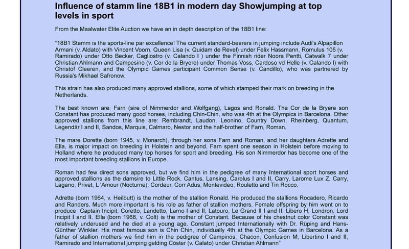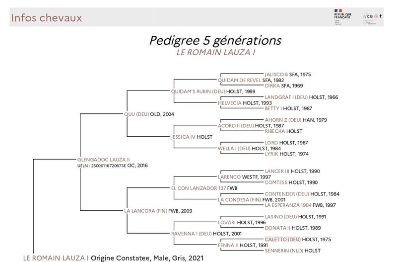 La jument de Le Romain, Hadrette Lauza, provient à la fois de son père et de sa mère de la légendaire lignée de juments Holsteiner stamm 18B1. Les lignées passent par deux branches différentes de l'arbre généalogique de la famille 18B1, remontant à Dorette (1945) et sa fille Adrette (1964), que beaucoup considèrent comme les juments clés les plus importantes du stamm 18B1. Le stamm 18B1 a souvent été classé par les résultats des compétitions de ses descendants parmi les meilleures, et même comme la lignée de juments numéro 1, non seulement en Holstein et en Allemagne, mais de toutes les lignées de juments en Europe en saut d'obstacles. El Dacapo (utilisé dans un élevage privé) a atteint le très apprécié Bundeschampionat allemand et y est allé jusqu'à la finale dans la catégorie des sauteurs de 5 ans. Son père, Diarado, est l'un des étalons Holsteiner les plus populaires et les mieux classés, avec de nombreux descendants réussis en saut d'obstacles et plus de 100 fils licenciés à l'international, promouvant le choix supérieur d'ajouter l'étalon Selle Français Diamant de Semilly à son élevage de haute lignée Holsteiner. J'inclus une photo du magnifique père de Le Romain, Glengadoc Lauza II (utilisé dans un élevage privé). Son père, Quu (utilisé dans un élevage privé), sautait au niveau de 1,40 m (0,0) avant que son accident ne l'oblige à se retirer de la compétition pour l'élevage. Son père était Quidam’s Rubin (licencié à Oldenburg et Holstein parmi d'autres livres généalogiques). Même si sa carrière d'élevage s'est terminée de manière malheureuse et rapide, elle a déjà été très réussie avec 30 fils licenciés et 202 descendants réussis en saut d'obstacles de niveau avancé (S) (plus de 1,75 million d'euros en prix, voir l'article inclus). Il était un Holsteiner bien consanguin de la jument Landgraf I, Helvecia (saut de 1,55 m) et l'ajout très réussi de l'étalon Quidam de Revel, issu de la lignée internationalement célébrée des Selle Français Ibrahim, Alme et Jalisco. El Con Lanzador était un étalon approuvé de Finlande et la jument de Lovari, Donata II, était une sœur pleine de Cassini I et II. J'ai un bon pressentiment pour Le Romain, je pense qu'il réussira bien en saut d'obstacles.