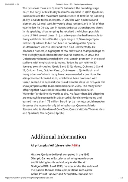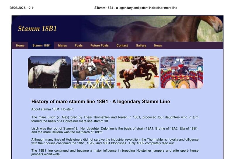 Die Stute Hadrette Lauza von Le Romain stammt sowohl väterlicher- als auch mütterlicherseits aus der legendären Holsteiner Stutenlinie Stamm 18B1. Die Linien führen über zwei verschiedene Zweige des Stammbaums 18B1 zurück zu Dorette (1945) und ihrer Tochter Adrette (1964), die viele als die wichtigsten Schlüsselstuten des Stamm 18B1 betrachten. Der Stamm 18B1 wurde mehrfach aufgrund der Nachkommenwettbewerbsergebnisse unter den besten und sogar als Nummer 1 Stutenlinie eingestuft, und das nicht nur in Holstein und Deutschland, sondern in ganz Europa im Springreiten. El Dacapo (im privaten Einsatz) erreichte das hochgeschätzte deutsche Bundeschampionat und schaffte es bis ins Finale der 5-jährigen Hengste. Sein Vater Diarado gehört zu den beliebtesten und hochrangierten Holsteiner Hengsten mit zahlreichen erfolgreichen Nachkommen im Springreiten und über 100 international lizenzierten Söhnen, was die überlegene Wahl unterstreicht, den Selle Français Hengst Diamant de Semilly in seine erstklassige Holsteiner Zuchtlinie hinzuzufügen. Ich füge ein Foto des prächtigen Vaters von Le Romain, Glengadoc Lauza II (im privaten Einsatz), bei. Sein Vater Quu (im privaten Einsatz) sprang auf 1,40 m (0,0) Niveau, bevor ein Unfall ihn zwang, seine Karriere im Wettkampf zugunsten der Zucht zu beenden. Sein Vater war Quidam’s Rubin (lizenziert in Oldenburg und Holstein unter anderem Zuchtbüchern). Obwohl seine Zuchtkarriere leider früh endete, war sie bereits sehr erfolgreich mit 30 lizenzierten Söhnen und 202 Nachkommen, die im schweren (S) Springen erfolgreich waren (über 1,75 Millionen Euro an Preisgeldern, siehe den beigefügten Artikel). Er war ein feiner linienzucht Holsteiner von der Landgraf I Stute Helvecia (1,55 m Sprung) und die sehr erfolgreiche Hinzufügung des Hengstes Quidam de Revel, aus der international gefeierten Selle Français Hengstlinie Ibrahim, Alme und Jalisco. El Con Lanzador war ein zugelassener Hengst aus Finnland und Lovaris Stute Donata II war eine Vollschwester zu Cassini I und II. Ich habe ein gutes Gefühl bei Le Romain, dass er im Springreiten gut abschneiden wird.