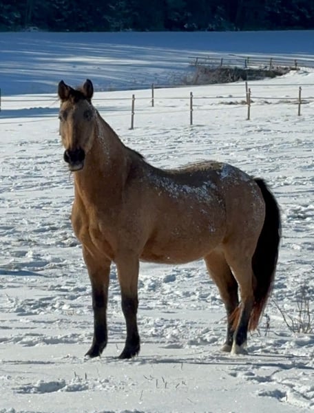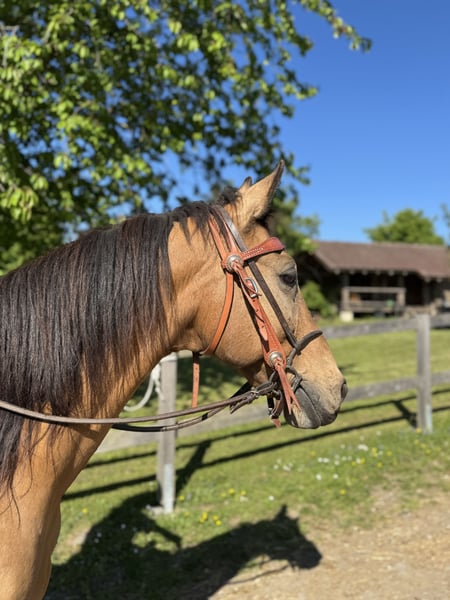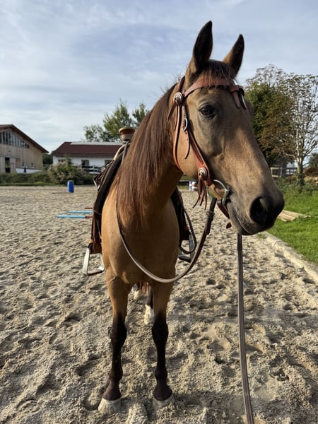 Unerschrockener Wallach sucht neuen Besitzer! Da Spirit leider für unserem Schulbetrieb nicht geeignet ist, wird er von uns verkauft. Schmiede- und Verladefromm. Er begeistert bei der Bodenarbeit. Er geht unterm Sattel alle Gangarten, und er war auch schon in Pullman City am Rind. Große Zuschauermengen schocken ihn auch nicht, geropt haben wir auch schon aus dem Sattel aus. Da er seinen eigenen Kopf hat ist er nur für fortgeschrittene Reiter geeignet. Wir wünschen uns für Spirit einen erfahrenen Pferdemenschen, der ihn auf seinem weiteren Weg begleitet - er ist ein guter Kerl mit Potential! Weitere Infos bei ernsthaftem Interesse!
