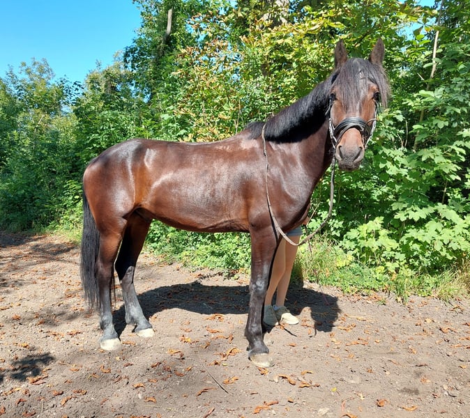 We are selling our approximately 16.1 hh, 5½-year-old gelding (Hungarian sport horse), ridden by my 15-year-old daughter. He is currently at a good basic level in dressage and works well on pole work. About six months ago, we started jumping training, and he now jumps around 80 cm. He has already gained experience in competitions and behaved exemplary in all handling, including trailer loading. During group rides, he remains relaxed and is not spooky. He stands patiently at the grooming area, but due to his age, we do not consider him suitable for beginners. He is very well-behaved at the farrier and is used to both open stable and box with turnout. X-rays from July 2024 show no findings. More information and videos are available upon request.