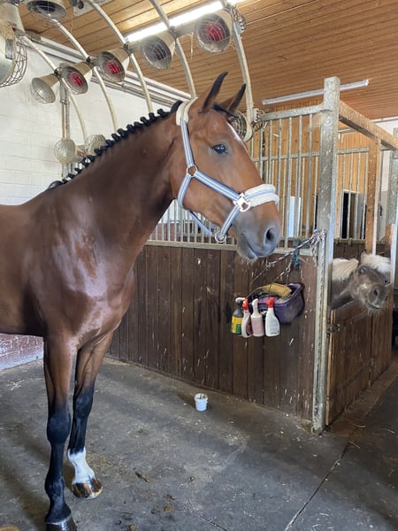 In vendita il nostro stallone di Quasimodo van de Molendreef. Q-Acht è un cavallo molto affettuoso e socievole, adatto a cavalieri esperti. Ha una buona capacità di montare e dispone di tre ottimi andamenti di base. Ha un piacevole impulso verso l'ostacolo e riflessi molto buoni. Si distingue per il suo carattere affettuoso e semplice da gestire ed è molto gradevole nel lavoro quotidiano, pertanto sarebbe adatto anche per sport ricreativi di alto livello. In caso di interesse, siamo lieti di ricevere un contatto per un appuntamento di visione o per ulteriori domande!