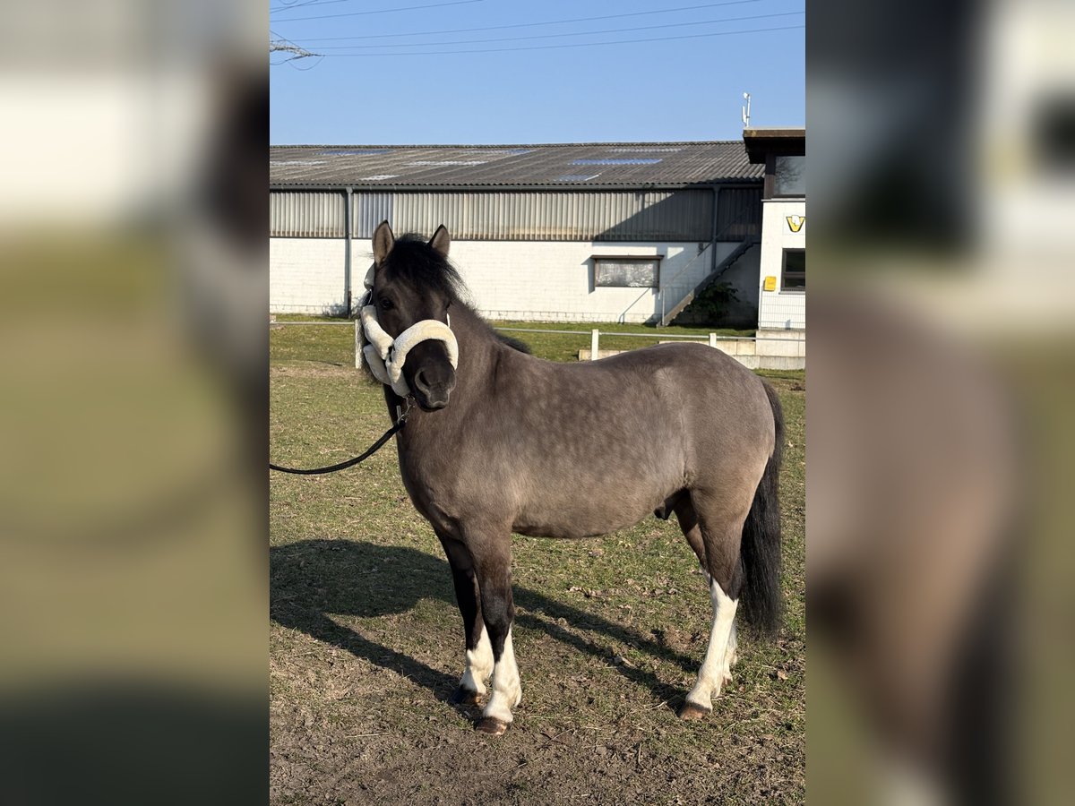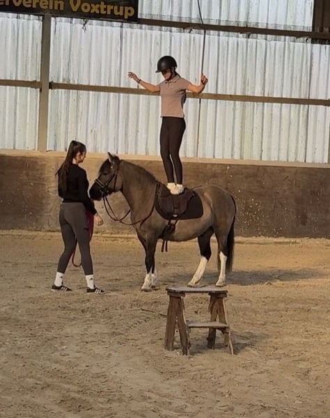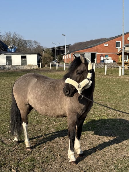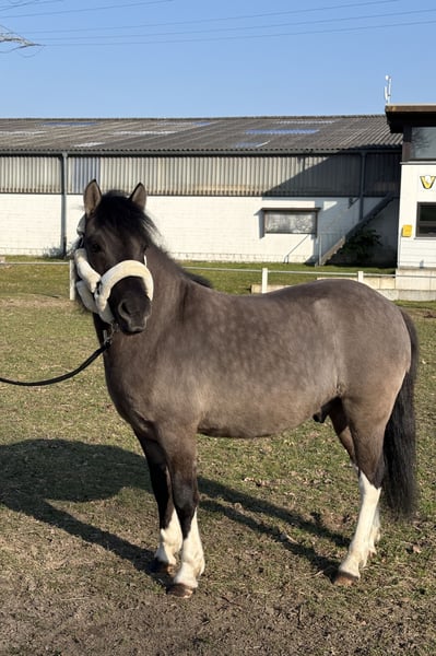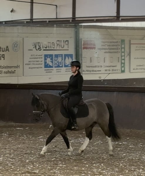 Fussel ist ein 5 jähriger Huzulen Wallach, in auffälliger Farbe Maus- Falbe ( Blue Du ) mit vier mal Weiß. Er zeigt sich im täglichen Umgang sehr lieb, unkompliziert und menschenbezogen. Er ist aktuell ca. 1,40m groß, sein Endmaß wird bei ca. 1,42m liegen. Er hat volle Papiere. Unterm Sattel will er immer gefallen und lernt wirklich schnell. Er ist stets brav und rittig und gibt dem Reiter ein gutes und sicheres Gefühl. Aktuell wird er dressurmäßig gearbeitet. Hier zeigt er sich kooperativ und ist einfach und fein zu reiten. Er hat drei schöne GGA und ist sehr Sitzbequem. Fussel wird Problemlos im Gelände geritten und hat auch schon einige Sprünge gemacht. Er ist nicht guckig oder Schreckhaft. Fussel kennt es von Kindern geritten zu werden, (keine Anfänger bis jetzt). Er geht auch in einer Abteilung - vorne, hinten, Mitte. Fussel deckt auch kleine Erwachsene gut ab. (Die Reiterin auf den Bildern ist ca. 1,72m groß) Aktuell steht er in einer Stutenherde, er steht aber auch problemlos mit Wallachen. Er läuft Barhuf. Fussel ist schmiede - und verladefromm. Videos gerne auf Anfrage. Für ein Probereiten wird eine Gebühr von 20€ verlangt, um Reittourismus zu vermeiden. Wenn es zum Kauf kommt, werden die 20€ selbstverständlich verrechnet.