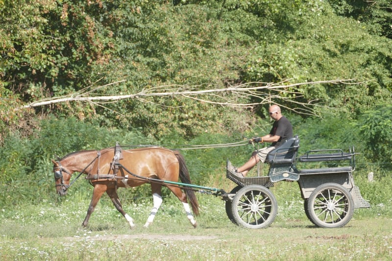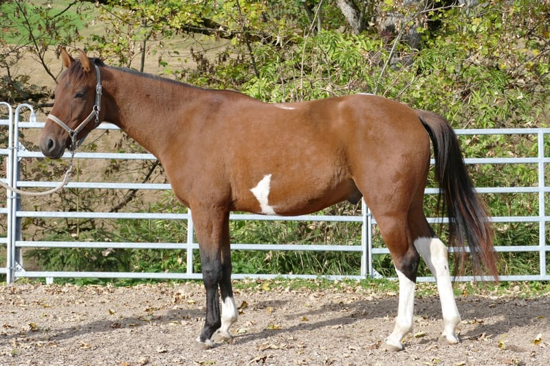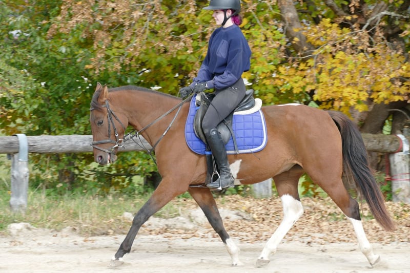 Huzule Gidran (Wbl.) crossbred, pinto, 150 cm tall. A smooth-gaited, stunning, calm-tempered type with a golden personality, excellent conformation, and a very positive presence; trained in single and double harness driving. Willing, brave, and uncomplicated under saddle, very easy to sit, confident riding alone in the field. Has potential for dressage and jumping. Easy to handle, a dream horse for the future for someone seeking something special! Shoeing and loading-friendly, suitable for an open stable, compatible with herd life.