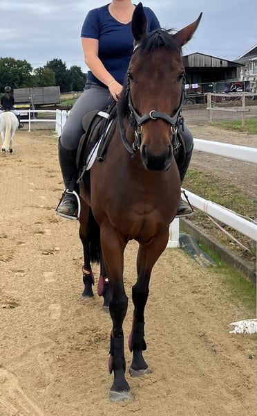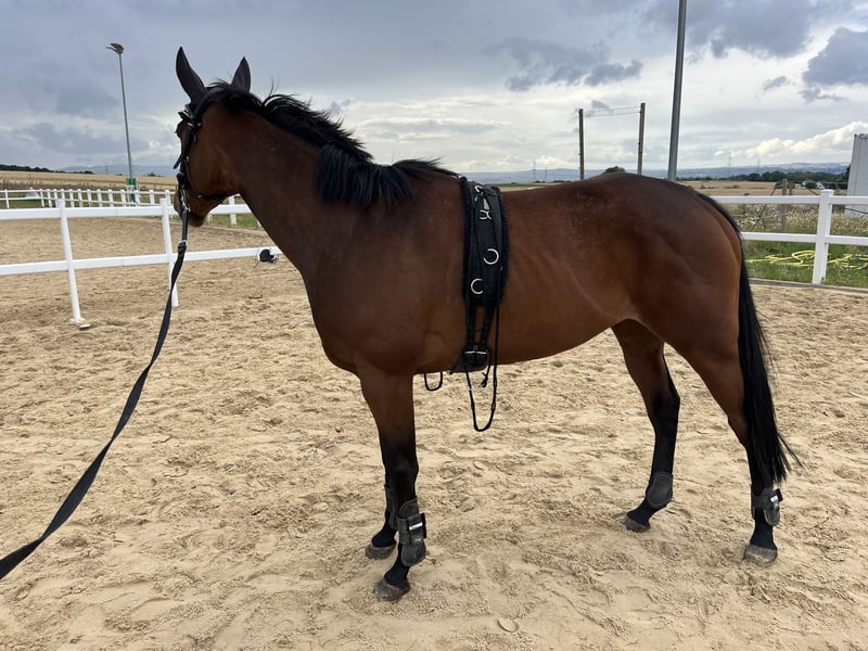 Mare, 6 years old, 160cm The mare is friendly and easy to handle. She can be lunged easily and goes well over poles and cavaletti on the lunge. She has also jumped with a rider. We are continuing her training, and the price will increase with further training. We are selling her only to a nurturing home. There is no reason for sale; she is currently being used a little in our riding school. We would be happy if she finds a 5-star home with a private owner. We can gladly ride her or lunge her for you, and trial rides can be arranged. 20€ Please contact via WhatsApp at 015204547603.