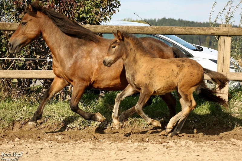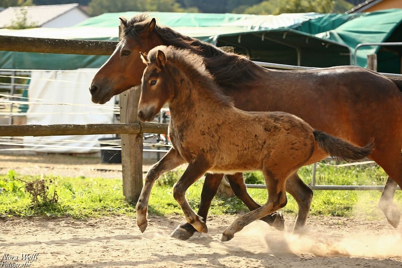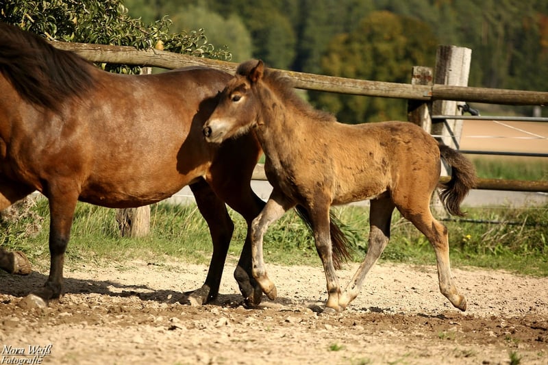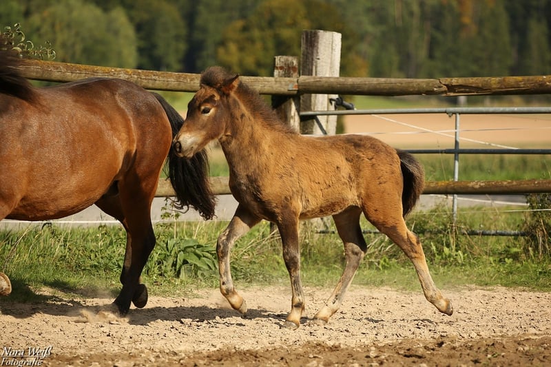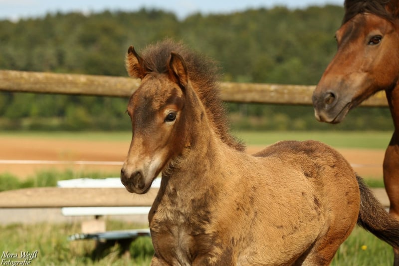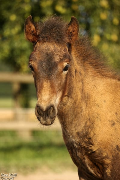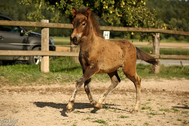 Bjarki vom Grafenbuch *18.07.2025 V: Eyður fra Hálakoti VV: Álfasteinn frá Selfossi (Ehrenpreis für Nachkommen) VMV: Oddur frá Selfossi (1 Preis für Nachkommen/ Ehrenpreis für Nachkommen) M: Brynja frá Ey1 MV: Visir frá Sydri-Gjöf (WM Teilnehmer) MVV: Keilir frá Midsitju (1 Preis für Nachkommen/ Ehrenpreis für Nachkommen) Unser Gute-Laune-Bär Bjarki ist bereit mit seinem Menschen richtig tolle Abenteuer zu erleben! Bjarki ist einfach ein toller Kerl! Er ist super keck und aufgeweckt, ganz mutig geht er in jede Situation und trotz seines noch jungen Alters lässt er sich von den älteren Fohlen nicht die Butter vom Brot nehmen. Er hat bereits jetzt schon einfach eine unglaubliche Präsenz, fällt im Paddock sofort ins Auge und hat einfach Spaß am Leben! Seine breite Brust und kräftige Hinterhand verleihen ihm nicht nur ein richtig knuffiges Aussehen sondern auch viel Kraft. Zur Zeit zeigt er sich deutlich Fünf-Gang veranlagt mit extrem starkerm Tölt. Traben kann er auch, bevorzugt aber fast immer den Tölt. Ein gut aufwärts gesprunger Galopp sowie klare Rennpassveranlagung gehören ebenfalls zu seinem ganglichen Repertoire. Bjarkis Vater Eyður fra Halakoti ist ein sehr großer (1,46m) hoch geprüfter (Gesamt 8,15) Sohn des legendären Álfasteinn frá Selfossi. Eyður ist zudem charakterlich ein wahrer Schatz! Absolut anständig, ohne Hengstmanieren, super leistungsbereit und immer angenehm zu reiten. Besonders sein super leicht zu reitender Tölt den man problemlos bis ins ganz hohe Tempo reiten kann hat mich beim Proberitt begeistert. Auch im Sport hat Eyður sich mehrfach bewiesen. Bjarkis Mutter Brynja ist mein persönliches Lieblingsreitpferd, sie ist eine sehr kräftige große Fünfgangstute mit gutem Tölt und Galopp. Sie hat einen ganz freundlichen, sanften Charakter. Unterm Sattel ist sie sehr temperamentvoll und strebsam dabei immer in gutem, feinen Kontakt mit dem Reiter und bemüht zu gefallen. Ich sehe Bjarki später ebenfalls als sehr vielseitiges Luxus Freizeitpferd mit dem man sicher auch auf dem ein oder anderen Turnier gut aussieht. Auch als Jugendsportpferd könnte ich ihn mir gut vorstellen. Bjarki ist komplett fit, er und seine Mutter bekommen beste Versorgung und werden in einer großen Herde mit weiteren Fohlen auf weitläufigen Weiden oder im Offenstall gehalten. Bjarki wird bereits als Fohlen alle Dinge des täglichen Lebens lernen und mehrfach Hänger fahren (Weideumzug) und selbstverständlich gründlich entwurmt und gepflegt werden. Zusätzlich wäre es möglich einen Aufzuchtplatz in unserer Junghengstgruppe für ihn zu erhalten.