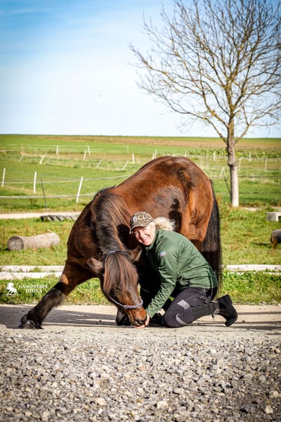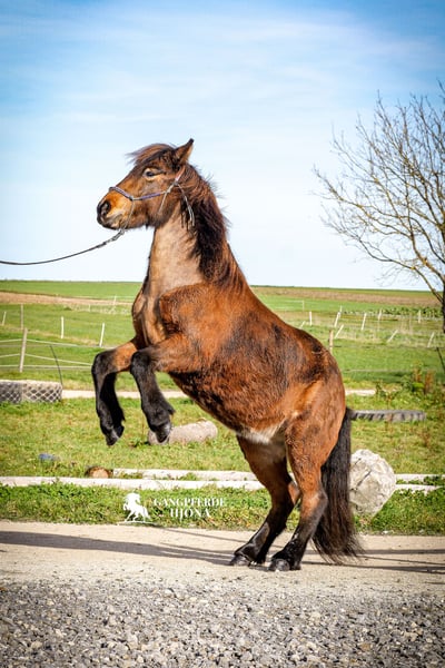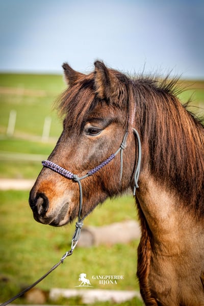 Glaera is a seasoned leisure horse who happily approaches each day with a cheerful spirit. She is open to all tasks and ideas her handler might have in mind and enjoys participating in shared activities. Age-appropriate, she brings life experience and demonstrates enthusiasm not only as a riding horse but also for circus tricks and tricks training. Her five gaits are easy to switch and well-separated. In a flowing tölt, she carries herself comfortably over rough terrain, even with loose reins. Her trot is secure, and her canter ranges from relaxed to well-sprung, as needed. She is also suitable for beginners' extended canter experiences, as she is easy to collect from the canter and the tölt is steady. Glaera has a classic Icelandic horse build, not tall but sturdy, with strong bones and tendons. She features a beautiful mare head and a gaze that’s simply captivating. Her movements are not overly high-stepping, making her exceptionally comfortable in all gaits. Character-wise, Glaera is a diligent horse who enjoys moving forward but remains sensible and easy to control. Standing still and waiting is no problem for her, even on the trail. She loves the outdoors, whether alone or in a group. She is also motivated and eager to work in the arena or on the riding track, always striving to please her rider. For us, she is the perfect horse for anyone seeking a cheerful five-gait horse with versatile training and experience. Ideal as a mother-daughter team, a school horse for advanced beginners, or simply for someone looking for an easy, experienced partner.