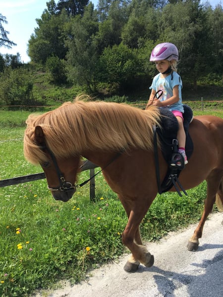 AT2009220959 Leiding ist 16 Jahre alt und eine echte Perle. Eine Freude für jeden feinen Reiter und ein absoluter Lehrmeister für Kinder und Jugendliche. Sie ist sehr sensibel im Sinne von leichtrittig, ganz fein, reagiert aufmerksam auf Sitz, Atmung und Stimme aber trotz ihres sensiblen Charakters ist sie absolut Bomb-proof. Leiding hat vor nichts Angst und schreckt sich vor nichts und niemandem. Verkehr, Traktoren, Schneepflug, Zug - alles kein Problem. Sie maschiert immer und überall zielsträbig vorran und ist ein Fels in der Brandung. Alleine als auch in der Gruppe. Von der Gangverteilung ist sie ein sehr ausgeglichener Fünfgänger. Ganz leicht zu reitender Tölt, sicherer Trab, bequemer Schritt. Galopp ist eher gelaufen aber im Gelände und vorallem leicht bergauf gut zu reiten. Leiding hat einen bombensicheren Rennpass, den sie liebt und locker im Tölt auflöst. Bei erwachsenen Reitern geht sie flott und fleißig vorwärts, Kinder trägt sie mit besonderer Vorsicht und passt richtig gut auf. Auch im Umgang ist sie absolut kinderlieb. Sie lässt sich geduldig führen, putzen, Hufe auskratzen, Mähne bürsten, es macht ihr nichts aus, wenn die Bürste auf den Boden kracht oder das Kind neben ihr mitsamt dem Sessel umfällt. Dressurmässig ist sie gut ausgebildet und ein echter Lehrmeister für Schüler/innen: Auf kleinste Hilfen reagiert sie mit Schulter herein, Krupp herein. Sie kann Traversalen im Schritt und Tölt, Schulterherein geht auch im Trab. Leider hat sie eine Heustauballergie und bräuchte deshalb einen Stall der für Allergiker ausgerichtet ist. Mit bedampftem/nassen Heu oder auch mit Heulage/Gärheu ist sie komplett beschwerdefrei. Weil sie einen sehr festen, kompakten und recht engen Huf hat bekommt sie sehr leicht Strahlfäule. Gute regelmässige Bearbeitung, Pflege und trockene Haltung ist also ebenso notwendig für sie. Dafür lässt sie sich super barhuf reiten: Schritt, Trab, Tölt und Rennpass sind barhuf gar kein Problem, nur im Galopp tut sie sich auf hartem Boden barhuf etwas schwer. Wenn sich ein Perfect Match ergeben würde, eine Familie die unsere Perle genauso liebt und schätzt wie wir, mit optimalen Haltungsbedingungen könnten wir uns einen Verkauf vorstellen. Weitere Informationen, Fotos und Videos gerne auf Anfrage. Ein Besuch ist jederzeit gerne möglich.