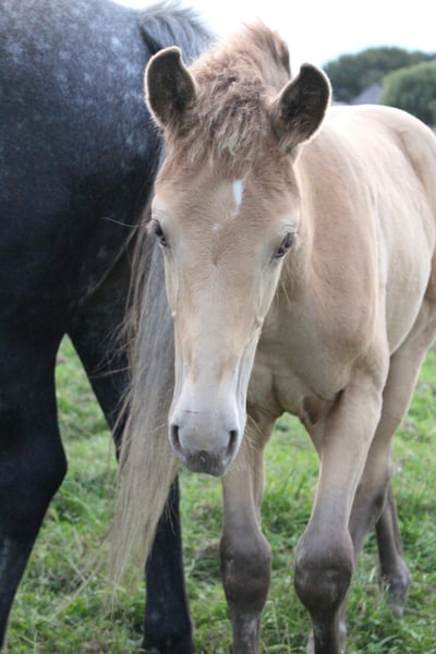 Pouliche Née le 30-05-2025 Elle possède une magnifique couleur champagne ambrée et devrait devenir une grande jument robuste et élégante. Elle grandit aux côtés de sa mère dans un troupeau stable composé d’individus de différents âges, ce qui lui offre une base sociale saine pour l’avenir. Origines : - Mère : Zep's Pixel des Woodystables, croisement entre un cheval de race Groninger et un Icelandic (résistant, fort, amical et polyvalent, taille au garrot 1,58 m) - Père : El Perrier van ‘t Pietershof - Perry, avec 43,75 % de sang arabe, provenant du côté maternel d’un croisement de cheval de trot (Rocky Mountain x Paso). Taille au garrot 1,52 m. Ce poulain est : - 25 % Icelandic - 25 % Groninger - 12,5 % Paso - 12,5 % Rocky Mountain - 21,875 % Arabe Il est pucé et inscrit au stud-book EASP. Caractéristiques : Caractère sain et curieux, très amical. Belle conformation avec des jambes fortes. Couleur particulièrement attrayante pour les amateurs. Déjà habitué à la forêt et à la plage, à donner les pieds, à être toiletté et marche bien en main. A déjà accompagné sa mère plusieurs fois en camion. Possibilité de faire analyser le DMRT3 (allures). Lieu : Schoorl (NH) Prix : 4 500 € N’hésitez pas à venir rencontrer ce poulain exceptionnel. Une opportunité pour ceux qui recherchent un compagnon remarquable et affectueux ! N’hésitez pas à me contacter pour plus d’informations ou pour organiser une visite.