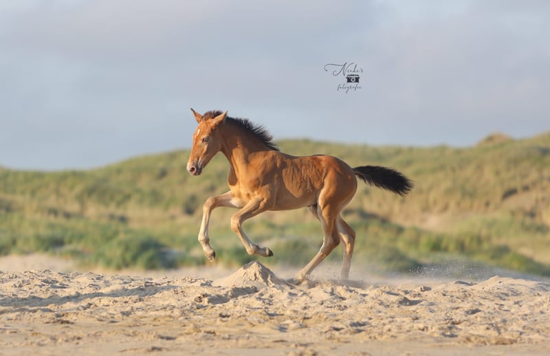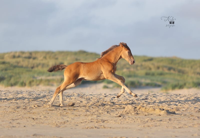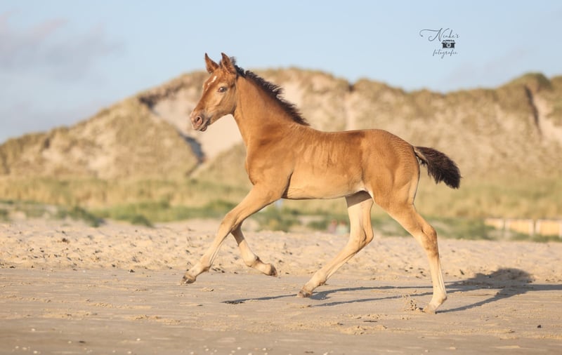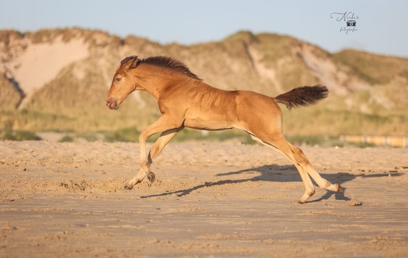 For sale: Beautiful filly Born on 30-05-25 She has a stunning amber champagne color and is expected to grow into a large mare just like her mother. She is being raised alongside her mother in a stable herd of various ages. This provides a nice and social foundation for the future. Pedigree: - Mother: Zep's Pixel van de Woodystables crossbreed Groninger horse x Icelandic – bombproof, strong, friendly, and versatile. Height 1.58 m. - Father: El Perrier van ‘t Pietershof - Perry 43.75% Arabian blood, and on the mother's side comes from a special gaited horse cross (Rocky Mountain x Paso). Height 1.52 m. Recently microchipped and registered with the EASP studbook. Characteristics: Healthy and curious character, very friendly. Beautiful build with strong legs. Unique color for enthusiasts. She is already used to many things such as forest and beach, picking up her feet, grooming, and walks nicely on a lead. Has already been on the trailer a few times with her mother. Possibility to test for DMRT3 (gaited). Location: Schoorl (nh) Price: upon request Feel free to come and meet this special foal. A great opportunity for anyone looking for a striking and sweet companion! Extra option: Currently, she is still staying with her mother, but she can be reserved with a deposit. Please message for more information or to arrange a viewing. Price negotiable, good home important.
