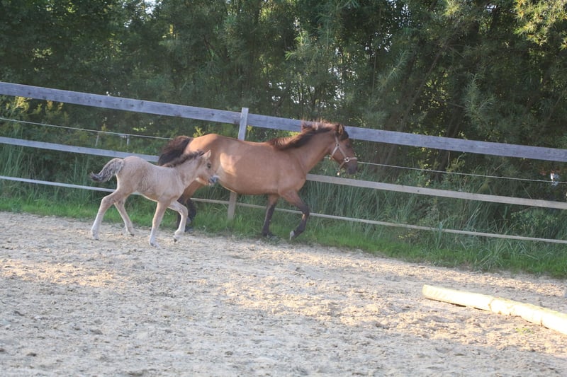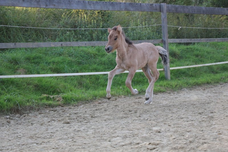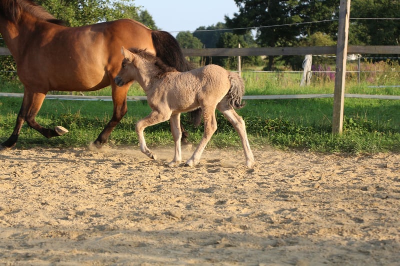 Verkaufe, wenn alles passt, mein wunderschönes Braunfalbfohlen. Eydís von Páskadagur ist am 24.07.2025 geboren. M: Elfa vom Lubberland V: Brilljant frá Efri-Fitjum Sie zeigt sich fünfgängig und verfügt über eine gute Aufrichtung und viel lockeren Tölt. Eydís ist ein unerschrockenes, selbstständiges und aufgewecktes junges Mädchen. Sie kennt Hufegeben, putzen und das Halfter. Beim Hängerfahren und in fremder Umgebung bleibt sie vollkommen gelassen. Farblich wird sie wie ihre Mutter. Die Mutter ist eine großrahmige (ca.1,45), stabile Stute mit butterweichen, gut verteilten fünf Gängen. Jeder Gang ist jederzeit abrufbar und sie verfügt über viel Ausdruck. Charakterlich ist sie eine vollkommen unerschrocken, selbstbewusste Stute. Ein Pferd das vielseitig einsetzbar ist und unglaublich viel Spaß macht! Eydís Vater, Brilljant, ist ein spannender Junghengst mit einer traumhaften Abstammung und fantastischen Gängen. Er ist ebenfalls Fünfgänger und besticht durch seine hohen, weiten Bewegungen! Charakterlich unglaublich freundlich und kooperativ. Ein tolles Pferd, von dem man sicher noch hören wird. Eydís kann Ende Januar abgesetzt werden. Sie ist selbstverständlich regelmäßig entwurmt, dem Schmied vorgestellt, gut mineralisiert und hat volle Papiere. Ich wünsche mir jemanden, der dieses Juwel zu schätzen weiß. Für Fragen stehe ich jederzeit zur Verfügung. Am besten vorbeikommen und verzaubern lassen!