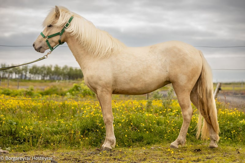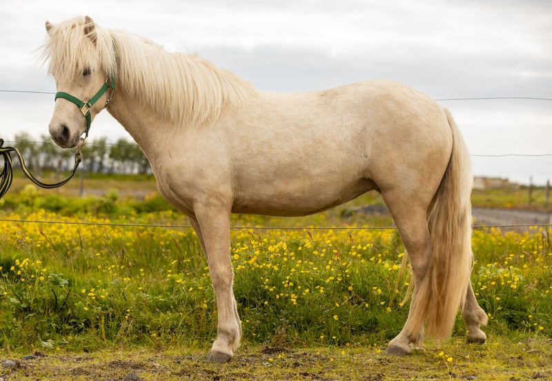 Happadís is a very sweet, beautiful, and easy 4-year-old palomino mare. She is contact- and human-oriented, easy to handle, and enjoys spending time with people. Just started under saddle. Now she is showing four gaits, with the possibility to develop into a five-gaited horse after training. She already shows tölt and trot. Her sire is Glóblesi frá Borgareyrum, a five-gaited first prize stallion with a total score of 8.32. Her dam is an outstanding riding horse – reliable in every situation and a wonderful partner for long-distance rides and trekking tours. With her friendly temperament, attractive looks Happadís has great potential as a riding horse for leisure or sport with further training.