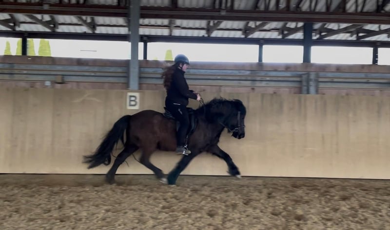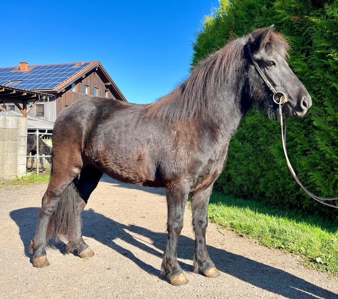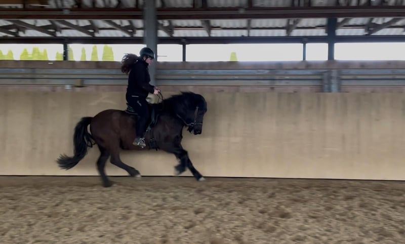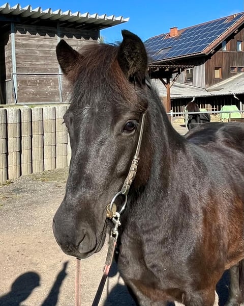 Ugla vom Göllert – Talentierte Nachwuchsstute mit Top-Charakter & Schwung Eckdaten: • Geboren: 2019 in Deutschland (7-jährig) • Abstammung: V: Mósart vom Hofgut Retzenhöhe/ M: Gletta vom Göllert • Größe: ca. 138 cm Beschreibung: Ugla ist eine bildhübsche, junge Rappstute, die durch ihre positive Einstellung und ihre hervorragende Gangqualität besticht. Sie ist ein Pferd, das jeden Tag Freude bereitet, da sie stets arbeitswillig und hochmotiviert bei der Sache ist. Ihre Grundgangarten sind weit überdurchschnittlich: • Trab: Besonders hervorzuheben ist ihr schwungvoller, elastischer Trab, den sie unverkennbar von ihrem Vater Mósart vom Hofgut Retzenhöhe geerbt hat. • Galopp: Sehr gut gesprungen, mit aktiver Hinterhand • Schritt: gelassen und raumgreifend, die Bewegung geht durch den ganzen Körper. Ausbildungsstand: Ugla ist altersgemäß ausgebildet und zeigt sich unter dem Sattel sehr kooperativ. Sie verfügt über ein angenehmes, natürliches Vorwärts, bleibt dabei jedoch jederzeit fein an den Hilfen und ist absolut regulierbar. Der Tölt ist vorhanden, benötigt jedoch noch weitere Festigung und Ausbildung, um die Kraft und Balance für längere Strecken und höheres Tempo zu finden. Aufgrund ihres klaren Kopfes und ihrer Lernbereitschaft ist sie hierbei jedoch sehr vielversprechend. Charakter: Ugla ist eine "coole Socke" mit einem extrem klaren Kopf. Sie ist unerschrocken, menschenbezogen und zeigt sich in neuen Situationen stets unbeeindruckt. Ihr freundliches Wesen macht sie zu einem idealen Partner für Reiter, die ein talentiertes Jungpferd suchen, das sie selbst weiter formen können. Auch als Wanderreitpferd können wir sie uns gut vorstellen. Sie ist völlig ohne Allergien und ohne Ekzem Das ideale Zuhause: Aufgrund ihres jungen Alters suchen wir einen geübten Reiter mit Jungpferdeerfahrung, der ihr Potenzial weiter fördern möchte. Ob für den Sport, gehobene Freizeitritte oder als Partnerin für Kurse – Ugla ist für alles offen. Herausragende Abstammung & Sportleistung: Ugla stammt direkt von dem sportlich hochkarätigen Mósart vom Hofgut Retzenhöhe ab. Mósart bewies seine Ausnahmequalität mehrfach auf Turnieren und qualifizierte sich bis zur LK2. Unter anderem lief er auf der DJIM 2023 im V2 Finale der Junioren. Seine Noten sprechen für sich: • V2 (Viergang): Gesamtnote 6,63 (mit einer beeindruckenden 7,17 für den Trab, 6,83 für den Galopp und 6,50 für Tölt/Schritt). • T3 (Tölt): Gesamtnote 6,23 (mit Noten bis zu 7,0 für schnelles Tempo Tölt). Diese Leistungsbereitschaft und die enorme Gangstärke hat Ugla unverkennbar geerbt. Preis steigt bei weiterer Ausbildung