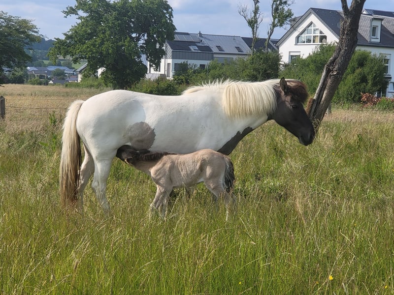 Verkaufe Islandpferd – Schecke,reinerbig Falbe, Stute, geb. 2019 Zum Verkauf steht eine wunderschöne Islandpferd-Stute, geboren im Jahr 2019. Sie besticht durch ihre ansprechende Scheckung und ihr angenehmes Gangbild. Sie ist freundlich im Umgang und eignet sich später sowohl für den Freizeitbereich als auch für den Turniersport.Sie hat beste Papiere und wurde in Stutbuch 1 eingetragen.Dies Jahr hatte sie ein sehr großes und schickes Stutfohlen,welches mit Gokd prämiert wurde. Als Mutter gab sie sich vorbildlich,sodass ein Einsatz in der Zucht sehr interssant ist.Bisher wurde sie anlongiert wobei sie sich als sehr einfach erwies.Sie wird wegen Bestandsrefuzierung und Zeitmangel unter Wert abegeben. Bei Interesse oder weiteren Fragen stehe ich Ihnen gerne zur Verfügung. Eine Besichtigung ist nach Vereinbarung möglich.