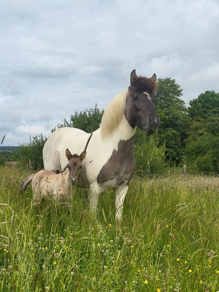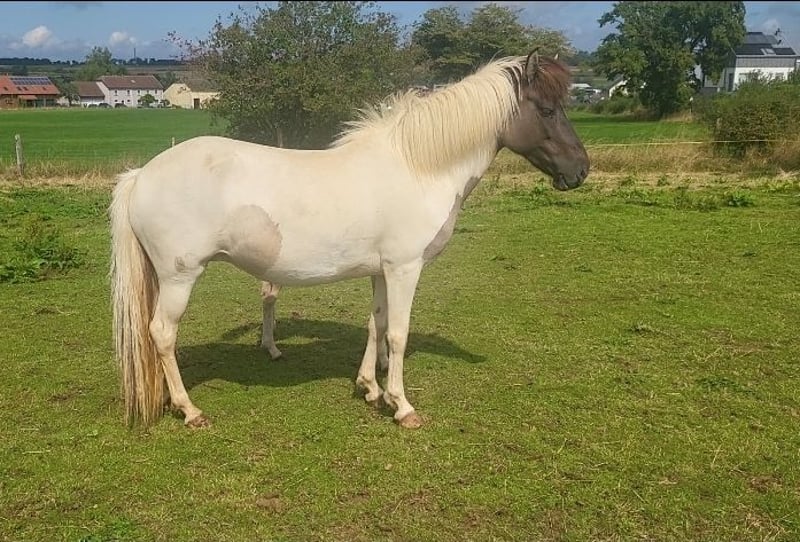 For Sale: Icelandic Horse – Piebald, Purebred Chestnut Mare, born in 2019 We are offering a beautiful Icelandic mare, born in 2019. She impresses with her attractive pinto coat and smooth gait. She is friendly and well-mannered, making her suitable for both leisure riding and competitive sport. She has excellent papers and is registered in the First Mare Book. This year, she foaled a very large and elegant filly, which was awarded a premium with Gokd. As a dam, she has proven to be exemplary, making her very interesting for breeding purposes. She has been lunged so far and proved to be very easy to handle. Due to herd reduction and lack of time, she is being offered below value. If you are interested or have further questions, please feel free to contact me. Viewing is possible by appointment.
