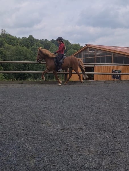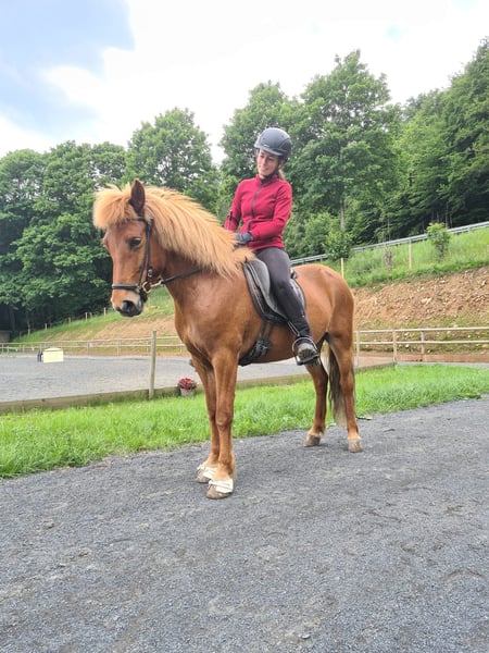 Saeunn - fein zu reitende Stute mit Endlos-Takt in allen Gängen Saeunn ist eine super süße 9-jährige Stute. Sie hat sehr viel einfach zu reitenden Tölt mit gutem Grundtakt und schönen Bewegungen. Diesen bietet in fast jeder Lebenslage mit großer Leichtigkeit an. Ihr Trab ist aber ebenso immer abrufbar, genauso der Galopp. Sie ist in allen Gangarten super leicht an den Hilfen und besticht neben dem tollen Takt durch ein ganz leichtes Genick. Ihre feinen Reaktionen und die hohe Kooperationsbereitschaft machen sie zu dem perfekten Freizeitpartner - egal ob tolle Ausritte, Reitkurse, Reitstunden oder kleinere Turniere - mit Saeunn wird man bei ALLEM einfach nur Spaß und Freude haben. Wir können uns für sie einen ambitionierten Freizeitreiter, aber auch einen Jugendlichen vorstellen. Aktuell wird sie von einer 15-jährigen Reitschülerin von uns mitgeritten und die beiden haben einfach nur Spaß miteinander! Aufgrund ihrer feinen Art ist sie nicht für absolute Anfänger geeignet.