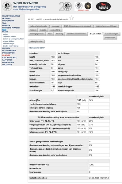 NL2021100035 - Jóvindur frá Gróskuholti 5-jarige ruin (in mei wordt hij 5), zweetvos met lange blonde manen en staart, BLUP 103 BLUP 105 voor tölt! Vader: IS2010155344 - Eldur frá Bjarghúsum (hooggekeurde IJslandse hengst met een 9 voor tölt, draf, galop en karakter!!) Vader v moeder: IS2009187197 - Glói frá Þorlákshöfn (hoge scores in de V2 en töltproeven) Jóvindur heeft de looks en een topkarakter. Hij is een heel aanhankelijke, zeer mensgerichte, open, eerlijke, nieuwsgierige, meewerkende natuurtölter. Niet snel ergens van onder de indruk, heel cool in z’n hoofd. Hij is niet dominant, ook niet in de kudde, hij is erg volgzaam en trouw en komt altijd naar je toe. Braaf bij de hoefsmid, tandarts en veearts, entingen zijn op orde, regelmatig ontwormd. Hij kent vaststaan, houdt van poetsbeurten. Hij is makkelijk op de trailer, loopt altijd keurig mee aan het halstertouw. Jóvi is momenteel ca. 1,39 m groot en groeit nog steeds door, we verwachten dat hij mininaal 1,40 m zal worden. Hij is sterk en stevig gebouwd en is een gewichtsdrager. In de wei laat hij al z’n gangen zien, hij heeft 4 goed gescheiden gangen en een goede gesprongen galop, zijn voorkeur is tölt. Jóvi is klaar voor de volgende stap in z’n carrière. We zoeken voor hem iemand die samen met hem verder wil groeien en opleiden om heerlijke töltritten te gaan maken. Ook op een wedstrijdje zal hij niet misstaan in de toekomst, gezien zijn afkomst en looks. Jóvindur heeft afgelopen zomer licht staart-eczeem ontwikkeld, maar met een deken is het goed te doen. Prijs voor Jóvindur is 8.000,- euro Wil je deze “golden boy” live komen bekijken of meer informatie? Neem dan contact met ons op: jockeylin@planet.nl