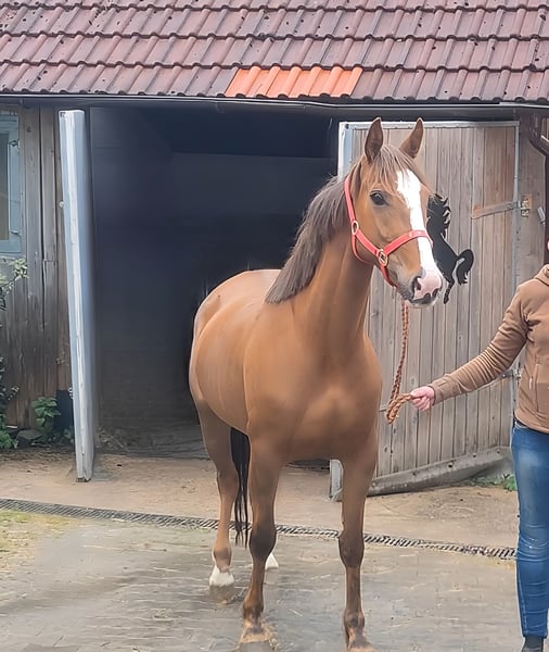 Yegua compacta de 3 años, de aproximadamente 162 cm de altura, con potencial digno de ser promovido. Con un carácter firme, ahora se puede comenzar con una educación sólida. Se puede organizar el transporte. La revisión veterinaria de compra también puede ser realizada por su propio veterinario, incluyendo radiografías y análisis de sangre. Las consultas deben hacerse exclusivamente por teléfono al 01774289729.