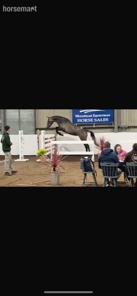 Currently standing at 16.1hh. Sire Corporal V.D.L (International Showjumper 1.60m) Damsire Douglas V.D.L (International Showjumper). Maternal Granddam (Izumi Irish T.B) has bred a Grand Prix showjumper (La Bouverie) this filly’s dam’s half-sister. Breeder owned, this filly has a very athletic scopey jump with a great technique. She has competed in the loose jumping RDS qualifiers for show jumping and eventing and was consistently ranked marginally outside the qualifying places. She had a kind, intelligent and a very trainable temperament. She had a strong athletic frame, shows great potential for show jumping or Eventing. She is correct and has a clean set of X rays. Everything available to view if you can travel to the yard. Located in Co.Meath, Ireland. Worldwide shipping available please contact us for a quote. Price €8,500 Euro or £7,350 Sterling approximately on day of sale