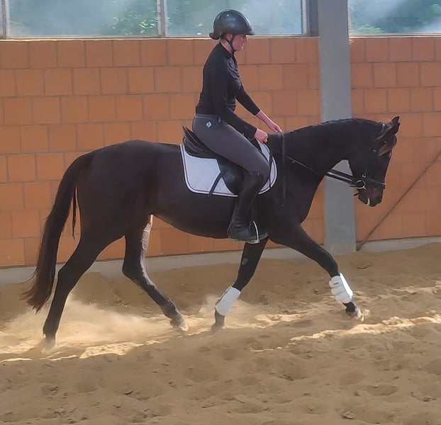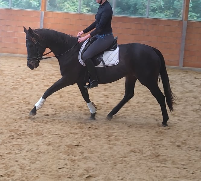 A beautiful 7-year-old black mare, approximately 166 cm tall, who always presents herself from her best side. A horse that knows how to attract attention. She is great to ride, easy to put on the bit, and comfortable to sit on. Riding this mare is a true pleasure. She has been ridden by children and less experienced riders, which worked perfectly. She is a fantastic leisure horse, but we could also envision her in competitive sports. She may also be interesting for a reasonable riding school operation. If needed, she can be sold with a complete new set of equipment for a small additional fee. Transport can be arranged. A veterinary pre-purchase examination can also be done by your own veterinarian, including X-rays and blood tests. We look forward to your call at 01774289729. Written inquiries will not be answered. We believe that those interested in a horse should call. All others who prefer not to respond to messages are kindly asked to refrain from contacting us.