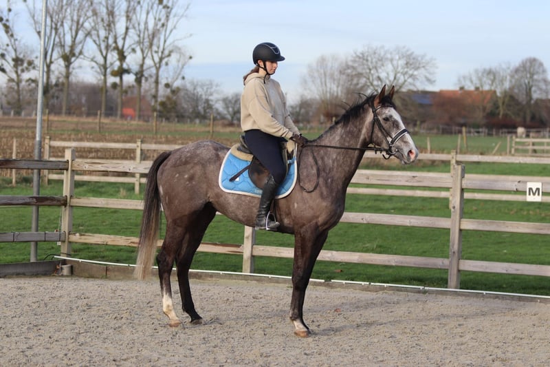 Edin – Selle sportive gris pommelé de 4 ans (environ 1,65 m) Edin est un joli selle sportive gris pommelé de 4 ans, avec une taille d'environ 1,65 m. Il est calme et doux dans ses interactions, et se laisse monter, brosser et soigner sans problème. Sous la selle, Edin se montre simple et agréable à monter, avec une attitude sportive. Il franchit aisément un parcours de 70 à 80 cm et n’est ni regardant ni peureux. Il convient donc aussi bien à un cavalier ambitieux qu’à quelqu’un recherchant un cheval fiable et agréable pour continuer son apprentissage. Edin est une belle apparence, correctement construit, avec toutes les proportions harmonieuses. De plus, il est facile à transporter. 📞 Plus d’informations ? 0032 475 68 22 43 🎥 Des vidéos sont disponibles – n’hésitez pas à demander notre site internet.