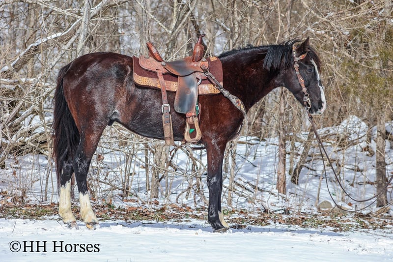 ONLINE AUCTION Place your bids at www.PlatinumEquineAuction.com Starting Bid $3500 Auction ends March 9th, 2025 Need a new saddle? Check out White Rock Saddles on our website or Facebook! This is “ZORRO”, a very smart, super smooth, naturally gaited BLACK ROAN KENTUCKY MOUNTAIN GELDING that is fancy, stylish, and has lots of ride. He aims to please and is an excellent trail horse. He has also been used for ranch work and been ridden out in the wide open spaces. He is 15 hands tall and 7 years old. He is fun to ride and stays in gait with no issues. He will also canter when asked and he stops easily. He will walk nicely on a loose rein. He goes willingly wherever you point him and he will cross icy streams and travel over snowy ground with confidence. He is sure footed and will cautiously travel up and down steep embankments. He has excellent ground manners, is very respectful of your space, and he pays attention to what you ask of him. He is a unique black roan with roaning throughout his flanks and loin area. He has an irregular blaze face with stocking legs making him really stand out wherever he travels. He has been on the roads and is traffic safe, he is not spooky, and he rides out alone fine. He will also ride in a group with no problems. He is a great horse that is very good gaited and he has a pleasant personality. He is intelligent, pretty, and extra comfy to ride. He is obedient and wants to do what’s right. If you’d like more info or want to make a Buy It Now Offer contact HH Horses Erin 304-238-4155 Located in Flemingsburg, KY. ONLINE AUCTION Place your bids at www.PlatinumEquineAuction.com Starting Bid $3500 Auction ends March 9th, 2025 Need a new saddle? Check out White Rock Saddles on our website or Facebook!