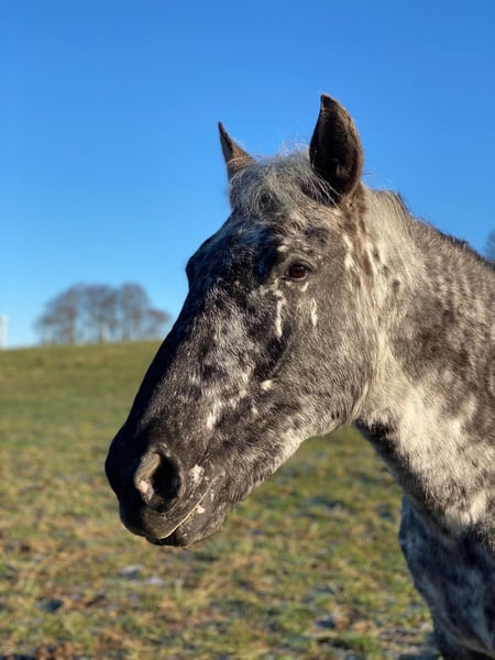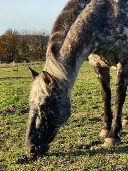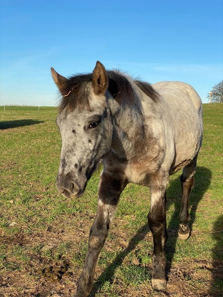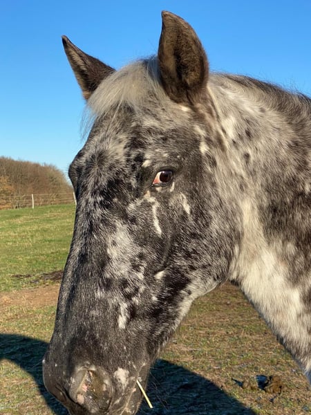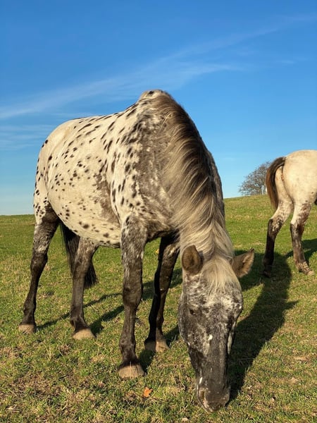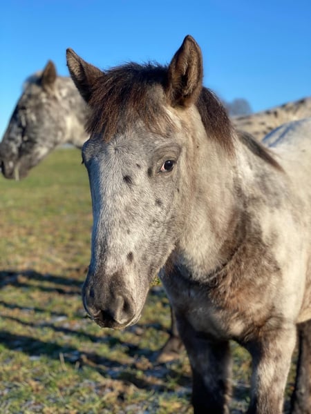 Lykke vom Duten ist eine sehr liebe und zurückhaltende Knabstrupperstute, in der Herde hier rangniedrig. Wir verkaufen sie nur weil wir unseren Bestand verkleinern. Sie ist eine tolle Zuchtstute aus einer alten Linie und hat mit dem derzeitigen Fohlen bei Fuß in 2025 ihr zweites Fohlen bekommen, ein Stutfohlen von Nöel Christal af Kronplet. Sie ist auch wieder von ihm tragend für nächstes Jahr. Das Stutfohlen kann mit verkauft werden. Eine sehr süße Maus, die anfangs einen Aalstrich auf dem Rücken hatte. Sie trägt den Namen Lille Oryx von Mohrkirchen. Vater von Lykke: Paco Mutter von Lykke: Lille Ged