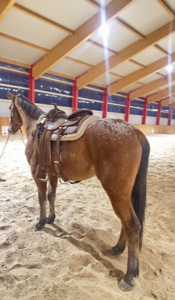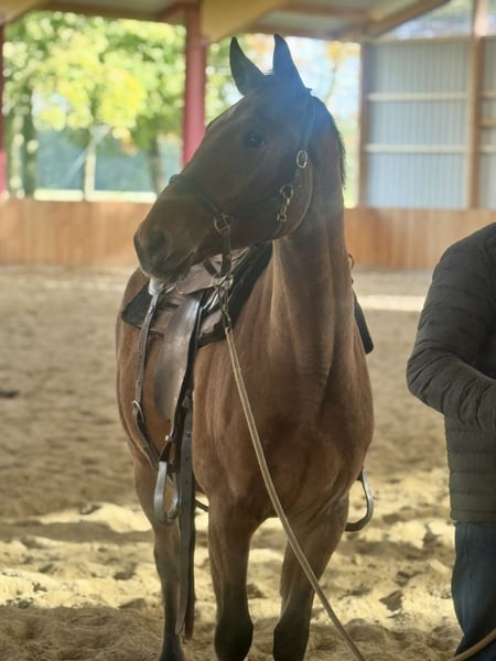 Zum Verkauf steht unser hübscher Knabstrupper Wallach Mr. Why Not „Marzipan“ ist ein auffälliger und aufmerksamer Kerl mit dem typischen, charmanten Wesen dieser Rasse. Er überzeugt nicht nur durch sein angenehmes Exterieur, sondern auch durch seine besondere Fellzeichnung, die sie zu einem echten Blickfang macht. Alter: 3 Jahre Rasse: Knabstrupper Geschlecht: Wallach Farbe: Brauner mit Schabrackenzeichnung Stockmaß: aktuell ca. 158cm (noch im Wachstum) ✅ verladefromm ✅ Regelmäßig entwurmt ✅ Robust gehalten, kennt Offenstall und Box ✅ Sozial super verträglich, kann entspannt mit Stuten Hengsten und Wallachen gehalten werden „Marzipan“ ist angeritten und zeigt sich stets aufmerksam und lernwillig. Er ist brav im Umgang, kennt das Longieren mit Sattel und Trense und die ersten Schritte unterm Reiter sind auch gemacht. Bedeutet also, er ist jetzt die ersten Male Schritt, Trab & Gallop geritten. Im täglichen Handling zeigt er sich freundlich und menschenbezogen hatte leider einen schlechten Start bei einem Pferdehändler und braucht daher etwas Ruhe und Vertrauen aber hat den Glauben ans Gute im Menschen nicht verloren. Dank seines korrekten Körperbaus und seiner eleganten Bewegungen bringt er die besten Voraussetzungen für eine vielseitige Nutzung mit – ob Freizeit, Dressur, Springen, Western oder einfach entspannt im Gelände. Er besticht durch seine federweichen Gänge und obwohl er erst kurz unterm Sattel ist kann man bereits spüren, dass er mal traumhaft zu reiten sein wird. Aktuell erhält er bei uns eine Western Grundausbildung. Ein ideales Nachwuchspferd für Menschen, die Freude daran haben, ein junges Pferd selbst auszubilden und eine enge Bindung aufzubauen. Auf Grund einer unbehandelten Hautverletzung beim Vorbesitzer musste in einer Klinik ein Schönheitsfehler entfernt werden, auch da überzeugte er mit vorbildlichen Verhalten und es konnte erfolgreich entfernt werden. Platz vor Preis da uns ein gutes Zuhause sehr am Herzen liegt