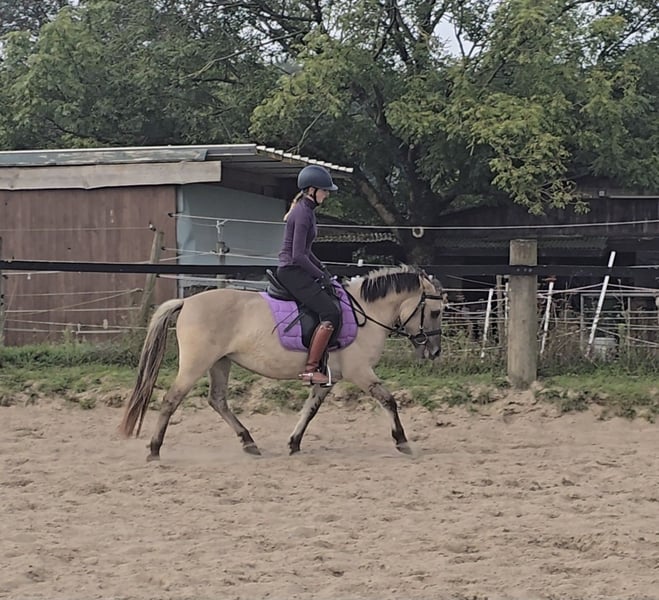 Please schedule an appointment at: +49 155 61855942 Feel free to contact via WhatsApp as well. Location: 45472 Mülheim Cinderella is a 3.5-year-old, approximately 1.28 m tall Connemara cross mare. Cindy is well-behaved, sensitive, and a gentle soul. She has shown good manners for her age and handles everything well. She has now been backed and is doing a fantastic job, making her suitable as a future children's pony. Of course, she still requires some fine-tuning here and there. However, she responds immediately, yields when asked, and listens attentively. Cindy is very rhythmic and eager to learn. She rides quietly on the bit and requires relatively little effort to ride. With further training, we can imagine her as a wonderful children's pony. The rider is 1.75 m tall, so she comfortably covers an adult rider and can be ridden by someone of any size. Cindy is barefoot, friendly, and enjoys cuddling. A veterinary examination (AKU) can be arranged at the buyer's request. To help reduce horse tourism, we charge €30 for the presentation and inspection of the horse. This fee also benefits the horses through osteopathy, veterinary care, chiropractic treatments, massages, solarium, muesli, carrots, and other care.
