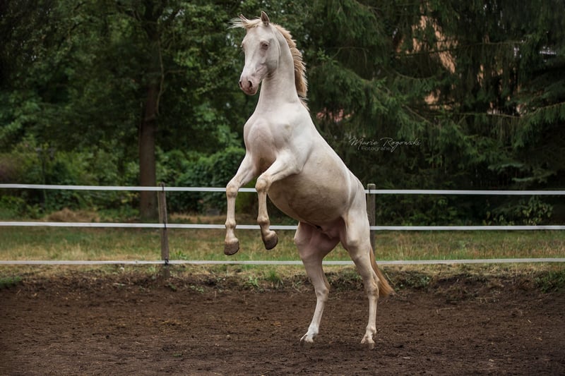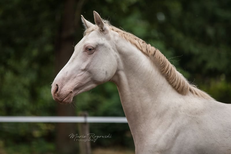 Warmblood stallion in perlino (double dilute) | born 2016 | 158 cm KWPN A-Book, bred in Germany Genetics: E/e A/a Cr/Cr Tested free of ECVM, PSSM2, MFM, RER (CAG Panel) Luminoso is a compact, charismatic stallion with a calm disposition and a pleasant work ethic. He was professionally broken in in 2022 and knows the basics under the rider. He is familiar with ground work and gymnastic work in hand, as well as the daily routine at the stud farm with all the associated procedures. He is sensitive, clear in communication and always friendly in his interactions. Luminoso was bred at the Palominogestüt Linda Thüringen stud farm from proven lines: on his sire's side, Marduc, Sandro, Inschallah and Landgraf I; on his dam's side, Weltmeyer, Los Alamos, Vollblut and old GDR Warblut lines. He carries two cream genes and therefore reliably passes on lightening – suitable for targeted colour genetics as well as smaller riding horse types.