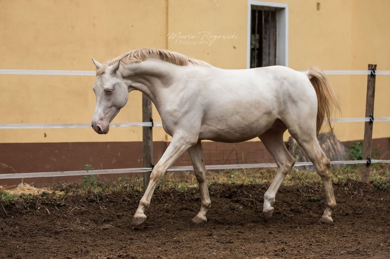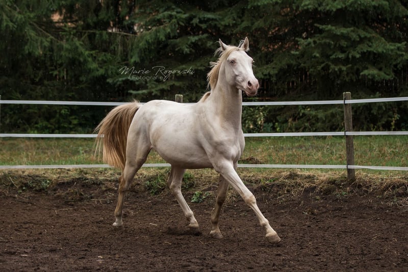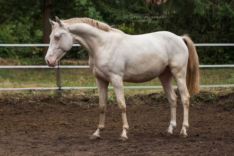 Warmblood stallion in perlino (double dilute) | born 2016 | 158 cm KWPN A-Book, bred in Germany Genetics: E/e A/a Cr/Cr Tested free of ECVM, PSSM2, MFM, RER (CAG Panel) Luminoso is a compact, charismatic stallion with a calm disposition and a pleasant work ethic. He was professionally broken in in 2022 and knows the basics under the rider. He is familiar with ground work and gymnastic work in hand, as well as the daily routine at the stud farm with all the associated procedures. He is sensitive, clear in communication and always friendly in his interactions. Luminoso was bred at the Palominogestüt Linda Thüringen stud farm from proven lines: on his sire's side, Marduc, Sandro, Inschallah and Landgraf I; on his dam's side, Weltmeyer, Los Alamos, Vollblut and old GDR Warblut lines. He carries two cream genes and therefore reliably passes on lightening – suitable for targeted colour genetics as well as smaller riding horse types.