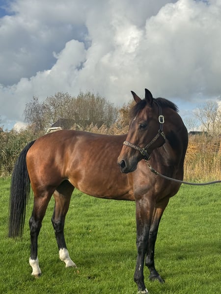Mijn mooie merrie is na een jaar weiderust helaas afgekeurd voor de sport en kan ook niet meer recreatief worden gereden. Ze heeft een afwijking in de 1e halswervel, waardoor ze een voorkeurshouding naar links heeft. Ze heeft geen pijn, is heel vrolijk en super braaf. Ik ben op zoek naar iemand die haar een 5 sterren huisje biedt en het leuk vindt om met haar te fokken. Ze staat graag in een kudde. Ze is gewend om met onze B en D pony’s op de weide en in de paddock te staan. Ze vindt grondwerk leuk om te doen en kan daar nog verder in groeien. Ze kan goed ingezet worden als coachingspaard, omdat ze heel erg mens gericht is. Mocht je interesse hebben, dan ontvang ik graag een korte toelichting. Overname in overleg.