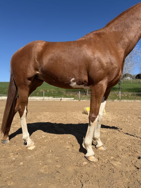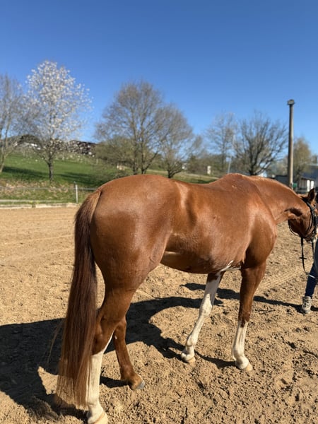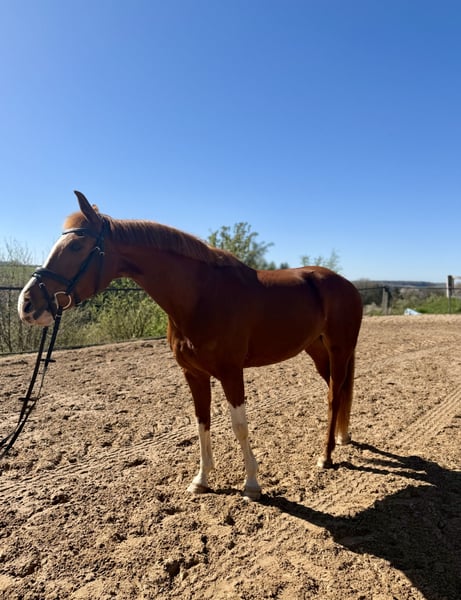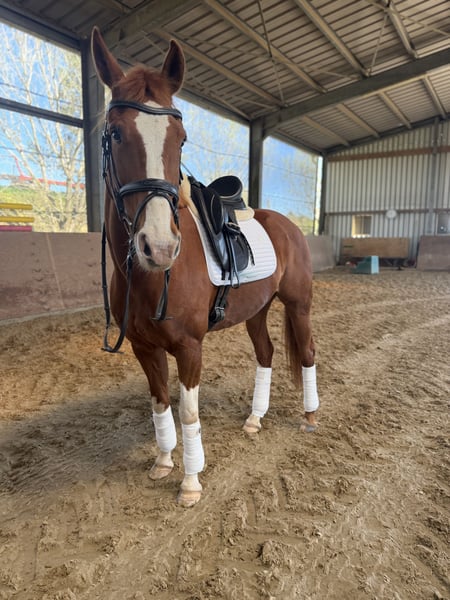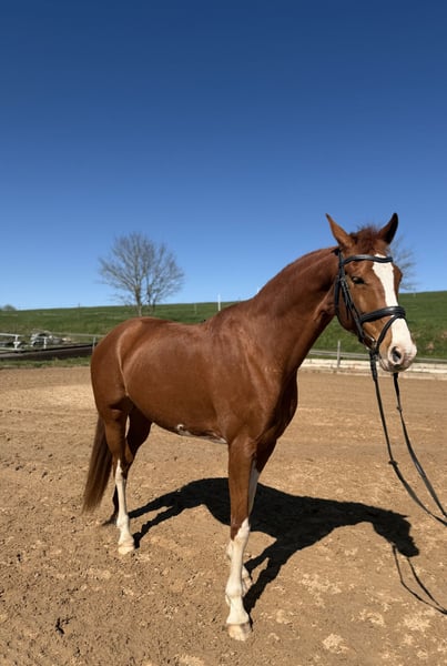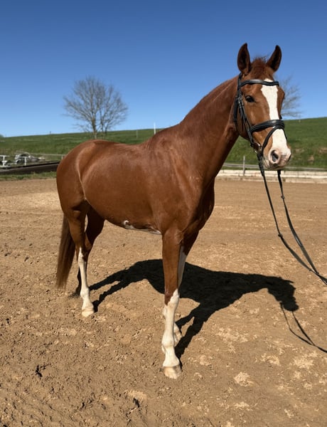 Zum Verkauf steht eine bunte KWPN-Fuchsstute, geboren im Jahr 2016 mit toller Abstammung. Lofie zeichnet sich durch ihre exzellente Rittigkeit aus. Sie reagiert gut auf den Schenkel und ist fein im Maul. Ebenso lässt sie sich problemlos auch ohne Sporen und Gerte reiten. Nach einer Reitpause aufgrund gesundheitlicher Gründe der Besitzerin ist die Stute seit einiger Zeit wieder unter dem Sattel und zeigt dabei große Fortschritte sowie viel Motivation bei der Arbeit. Lofie wird jedoch nicht als Anfängerpferd verkauft und benötigt gerade zu Beginn des Reitens und der weiteren Ausbildung einen erfahrenen Reiter mit Gefühl, Ruhe und Routine. Die Stute wurde bisher freizeitmäßig geritten und kennt auch den Westernsattel. Sie zeigt zudem Freude am Springen, wird in dieser Sparte jedoch erst seit kurzer Zeit gefördert. Im täglichen Umgang ist Lofie unkompliziert und kennt verschiedene Tiere wie Esel, Hühner, Pfauen, Katzen und Hunde. Außerdem ist sie schmiede- und verladefromm. Aufgrund ihres Temperaments und ihres aktuellen Ausbildungsstandes wünsche ich mir für sie einen erfahrenen Reiter, der sie weiterhin fördert und fordert und ihr ein passendes Zuhause bieten kann. Die Stute eignet sich besonders für ambitionierte Reiter, die ein Pferd mit Entwicklungspotenzial suchen und Freude daran haben, gemeinsam weiterzuarbeiten. Kennt Boxenhaltung und Offenstall. Passendes Zubehör kann gegen Aufpreis mit erworben werden. Bei Fragen: 01729077949
