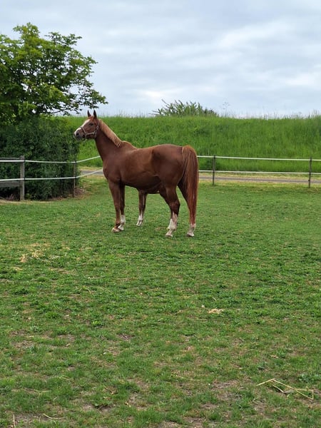 In connection with the cessation of breeding and a move, a beautiful, well-behaved Emerald mare. Kemeralda is pregnant by Fürst Dior. Kemeralda is saddle broke, very well-behaved under saddle, and sharp! Kemeralda has been radiographically examined and approved.