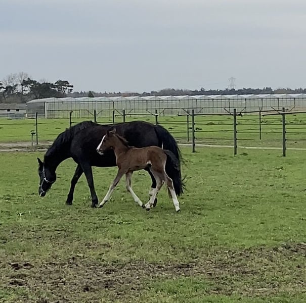 ⚜️ Uhreste Maxi de Elegante ⚜️ Are you looking for a foal with charisma, quality, and character? Then meet our Maxi – an exceptionally beautiful and promising mare, born from a unique cross between the spirited Spanish 🇪🇸 blood of the PRE and the modern elegance of the 🇳🇱 KWPN warmblood. PRE stallions are renowned for their expressive movement and can add tremendous presence and energy to modern dressage breeding. Their brave temperament is also inherited and has a highly positive influence on the offspring of crossbred breeding programs. This stunning young lady is not only a real eye-catcher but also possesses everything needed for a successful future in sport and as a reliable partner. Vaccinations, deworming, and farrier work – no problem! Halter-trained and comfortable around strangers. She is fully trusting of people. The best of both worlds – crossing PRE x KWPN KWPN mare, born March 20, 2024, out of Elegante de Millan III x Lombardi x Ultimo Expected final height: approximately 16.1 hh Our foals are kept outdoors 24/7 from birth whenever weather permits. Numerous studies show that this is the foundation for a particularly strong horse. It results in fewer injuries later on, and tendons and bones become especially resilient. They grow up as a family – mares, colts, and fillies together – which greatly promotes their social development. Something many foals lack in their first months of life. Later in their upbringing, they live in a mixed herd with horses of all ages, ensuring good socialization through a clear hierarchy. This gives our foals a solid foundation and the best possible start in life. They will benefit from this throughout their entire lives – and for future owners, it’s a significant advantage to have a horse with such a healthy and stable base. Our foals are introduced early to various everyday noises: tractor, leaf blower, umbrella, brush cutter – everything that makes noise in daily life.