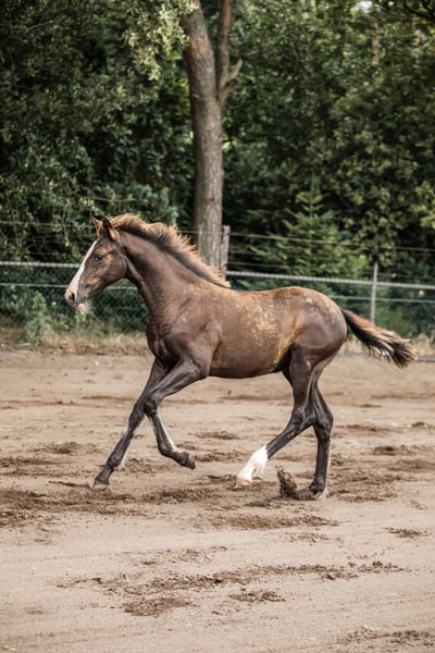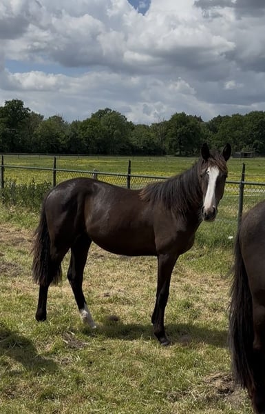 ⚜️ Uhreeste Maxi de Elegante ⚜️ Bent u op zoek naar een veulen met uitstraling, kwaliteit en karakter? Maak dan kennis met onze Maxi – een uitzonderlijk mooi en veelbelovend merrie, ontstaan uit een unieke kruising tussen het temperamentvolle Spaanse 🇪🇸 bloed van het PRE en de moderne elegantie van het 🇳🇱 KWPN warmbloed. PRE-hengsten staan bekend om hun verzameling en kunnen de moderne dressuurpaardenfokkerij enorme expressie en energie geven. Ook het moedige karakter wordt doorgegeven en heeft een zeer positieve invloed op de nakomelingen van de kruising. Deze adembenemende jonge dame is niet alleen een echte blikvanger, maar beschikt ook over alles wat je wenst voor een succesvolle toekomst in de sport en als betrouwbare partner. Vaccineren, ontwormen en hoefsmid – geen probleem! Halvervoer is ook mogelijk met onbekenden. Ze heeft volledig vertrouwen in mensen. Het beste uit twee werelden – kruising PRE x KWPN KWPN-merrie, geboren op 20-03-2024 uit Elegante de Millan III x Lombardi x Ultimo Verwachte eindhoogte: + 1,70 m Onze veulens staan – indien het weer het toelaat – vanaf de geboorte 24/7 buiten. Talrijke studies tonen aan dat dit de basis vormt voor een bijzonder sterk paard. Daardoor zijn ze later minder vatbaar voor blessures, en worden pezen en botten extra sterk. Ze groeien op als familie – merrie, hengst- en merrieveulens samen – wat hun sociale ontwikkeling enorm bevordert. Iets dat veel veulens in de eerste levensmaanden ontbreekt. Ook later in de opfok leven ze in een gemengde kudde met paarden van alle leeftijden, wat zorgt voor een goede opvoeding door een duidelijke hiërarchie. Zo krijgen onze veulens een stevige basis en de best mogelijke start in het leven. Daar zullen ze hun hele leven profijt van hebben – en voor toekomstige eigenaren is het een groot pluspunt om een paard te hebben met zo’n gezonde en stabiele basis. Onze veulens wennen al kort na de geboorte aan alles: tractor, bladblazer, paraplu, heggenschaar – alles wat lawaai maakt in het dagelijks leven.