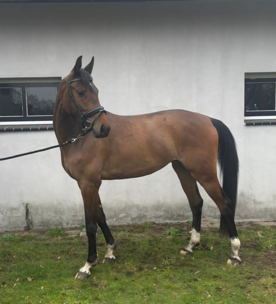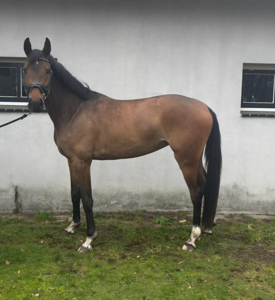 For Sale (English below): a gentle and honest young mare from a strong, showjumping-oriented pedigree. This bay mare is a late foal (born June 2022) and is expected to grow a bit more. She is not very tall; her current estimated height is approximately 16.1 hh (about 165 cm). She has a small star on her forehead and four white socks. The mare has recently been backed and has already free jumped once, demonstrating good attitude and technique. She is currently being lunged properly. Due to the lack of a suitable saddle at the yard, she is not currently ridden or under saddle. Pedigree: Mans x Indoctro x Mister Concorde This pedigree guarantees quality, scope, and a good mentality: Mans (by Burggraaf) competed at international level himself and is known for passing on scope, rideability, and a pleasant temperament. Indoctro is a proven top sire with numerous international showjumpers and champion horses, renowned for his technique and reliability. Mister Concorde adds blood, sharpness, and athletic ability, having produced several successful sport horses. This mare is an intriguing future prospect for sport or breeding, ideal for someone wishing to further develop a young horse. She has ample time to continue her physical and mental growth. Viewing by appointment For more information or questions, please call +31 6 53929991 (Theo Reijnen) or email theoreijnen@outlook.com