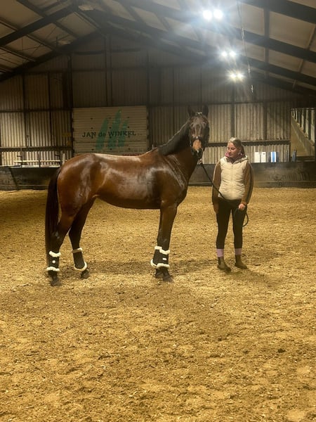 Te koop: 4-jarige (wordt 5) allround merrie met topafstamming Te koop aangeboden: een lieve en brave 4-jarige merrie (wordt dit jaar 5) met een pittig karakter. Ze is een eerlijke merrie, maar heeft wel een handige ruiter nodig die af en toe een bok kan uitzitten. ❌Ze is dus absoluut niet geschikt voor een beginner. Ze is ongeveer 1.63 m (niet officieel gemeten). Afstamming Koning x Chippendale een zeer sterke en interessante bloedlijn, waardoor ze ook zeker interessant is voor de fokkerij. Ze is ook prok goed gekeurd. Ze is goed zadelmak en klaar om verder opgeleid te worden. Tijdens de lessen heeft ze al enkele keren een parcours gesprongen, wat ze verrassend goed doet voor een dressuurgefokte merrie. Daarnaast laat ze veel potentie zien voor de dressuur, waardoor we haar zien uitgroeien tot een leuke allround sportmerrie. Wij denken dat zij perfect past bij een stoere, consequente ruiter die haar de tijd en aandacht kan geven om zich verder te ontwikkelen. Een goed en passend huisje vinden wij veel belangrijker dan de vraagprijs. De verkoop heeft niets met haar kwaliteiten te maken want ik vind het een ontzettend gaaf paard maar met een gebrek aan tijd en klik van onze kant gun ik haar gewoon iemand die volledig voor haar gaat. 📍 Alleen serieus geïnteresseerden 🏡 Goed tehuis is een vereiste 👉🏼 keuren kosten koper. Ze is bij de vorige eigenaar prok goedgekeurd. 📹 voor een filmpje kan je contact op nemen met 0619639398