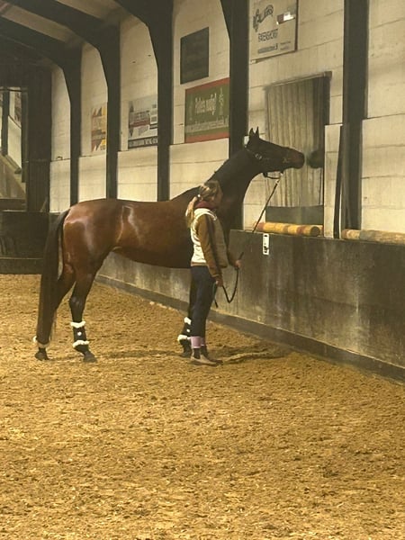 Zum Verkauf: 4-jährige (wird 5) Allround-Stute mit hervorragender Abstammung Zum Verkauf steht eine liebevolle und brave 4-jährige Stute (wird dieses Jahr 5) mit einem lebhaften Charakter. Sie ist eine ehrliche Stute, benötigt jedoch einen erfahrenen Reiter, der auch gelegentlich eine kleine Herausforderung annimmt. ❌ Sie ist daher absolut nicht für Anfänger geeignet. Sie ist etwa 1,63 m groß (nicht offiziell vermessen). Abstammung: Koning x Chippendale – eine sehr starke und interessante Blutlinie, was sie auch für die Zucht äußerst interessant macht. Sie ist zudem vollständig gekört. Sie ist gut eingeritten und bereit, weiter ausgebildet zu werden. Während der Unterrichtsstunden hat sie bereits mehrere Springparcours absolviert, was für eine dressurgezogene Stute überraschend gut klappt. Außerdem zeigt sie viel Potenzial für die Dressur, weshalb wir sie auf dem Weg sehen, sich zu einer vielseitigen Sportstute zu entwickeln. Wir denken, dass sie perfekt zu einem konsequenten, erfahrenen Reiter passt, der ihr die Zeit und Aufmerksamkeit schenkt, um sich weiter zu entwickeln. Ein gutes und artgerechtes Zuhause ist uns viel wichtiger als der Verkaufspreis. Der Verkauf hat nichts mit ihren Qualitäten zu tun, denn ich halte sie für ein unglaublich tolles Pferd. Aufgrund von Zeitmangel und einer fehlenden Verbindung möchten wir ihr jedoch jemandem anvertrauen, der voll und ganz für sie da ist. 📍 Nur ernsthafte Interessenten 🏡 Ein artgerechtes Zuhause ist Voraussetzung 👉🏼 Kosten für die Untersuchung trägt der Käufer. Sie ist beim Vorbesitzer vollständig gekört. 📹 Für ein Video können Sie Kontakt aufnehmen unter 0619639398